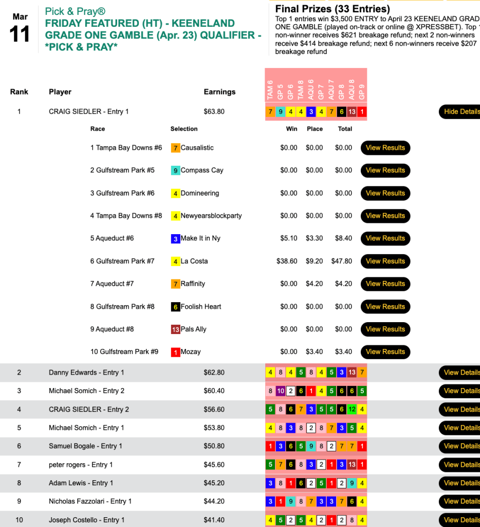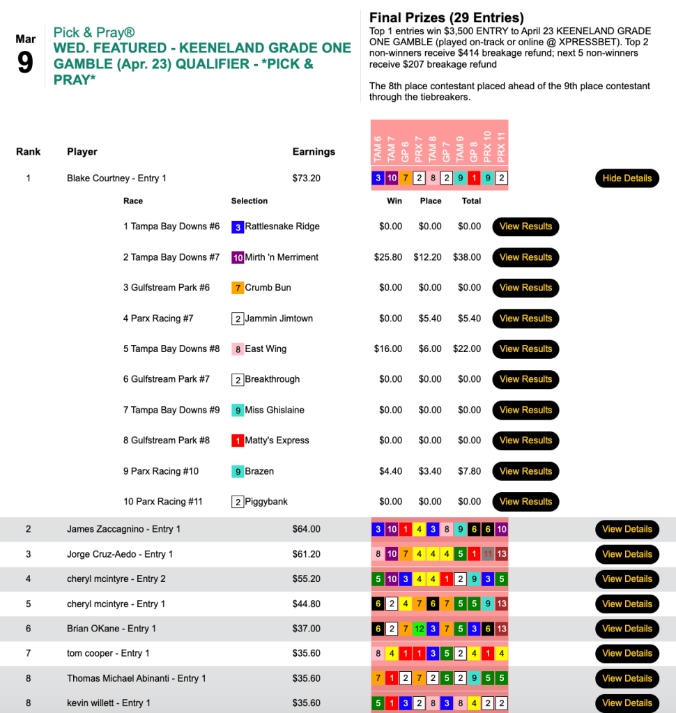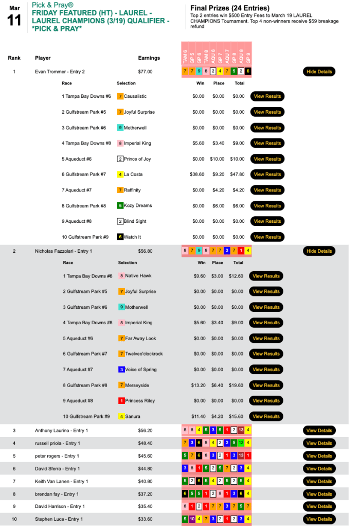 Trommer had 3 winners and 2 places to prevail in our first qualifier to the April 2 Florida Derby Challenge.