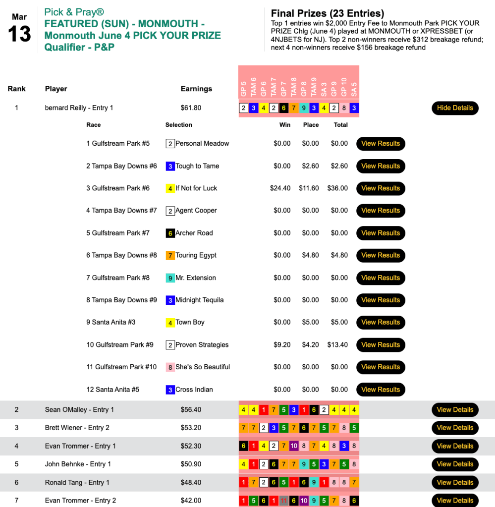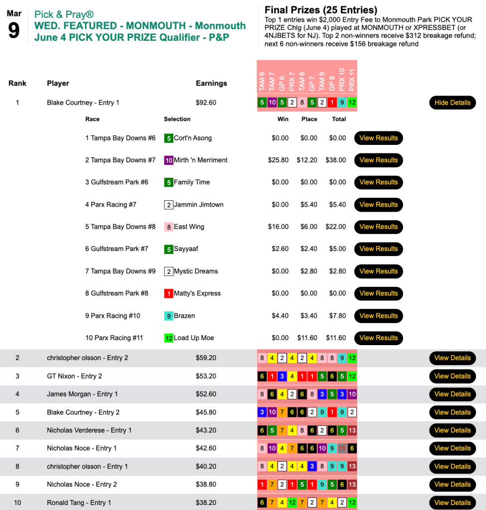 Unlike Blake Courtney, Trommer just locked into 10 horses and played them in each event. That strategy (or is it “non-strategy”?) worked just fine in Friday’s Monmouth Pick Your Prize play-in.