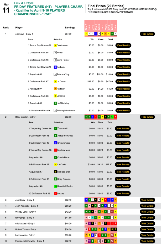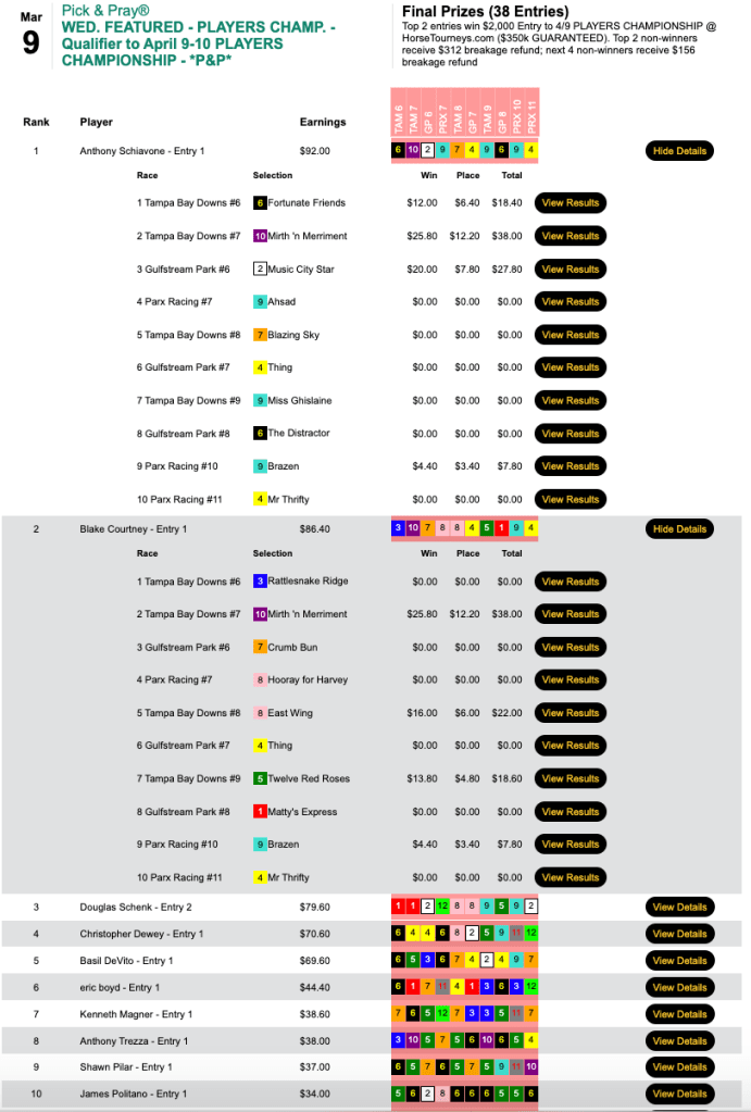 Unlike some who play in multiple contests in a day, Courtney doesn’t always just play the same 10 or 12 horses on every ticket. He likes to mix things up a bit. In Wednesday’s Players Championship qualifier, he had 4 wins and no places (instead of 4 wins and 3 places) and his score dipped a bit compared to his Monmouth tally.