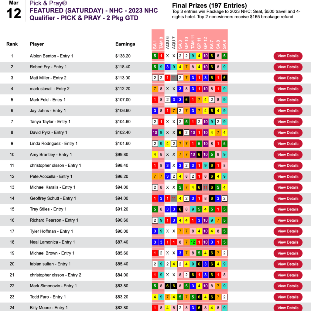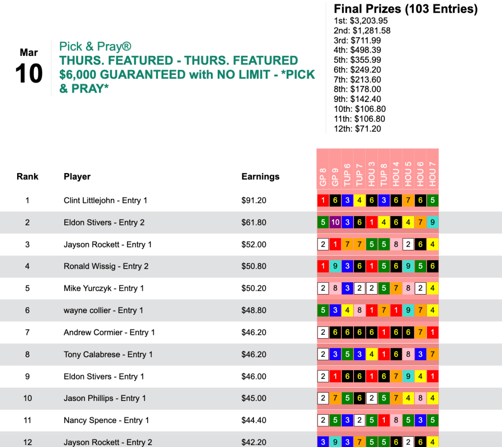 Andrew Walker pocketed $14,553 in the weekend’s richest tourney, our $30,000 Guaranteed Pick & Pray, which served as Saturday’s HT Tour event and closed with a purse of $32,340. Here’s a look at his scoresheet.
