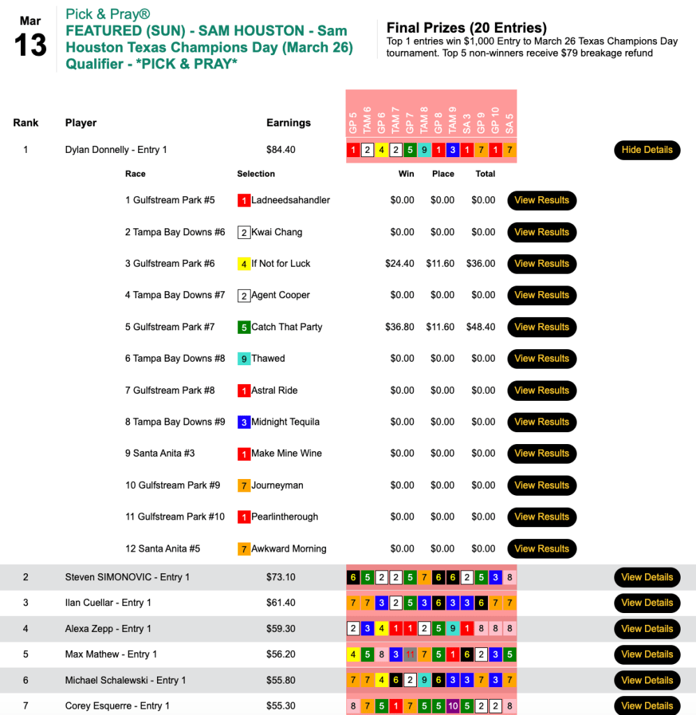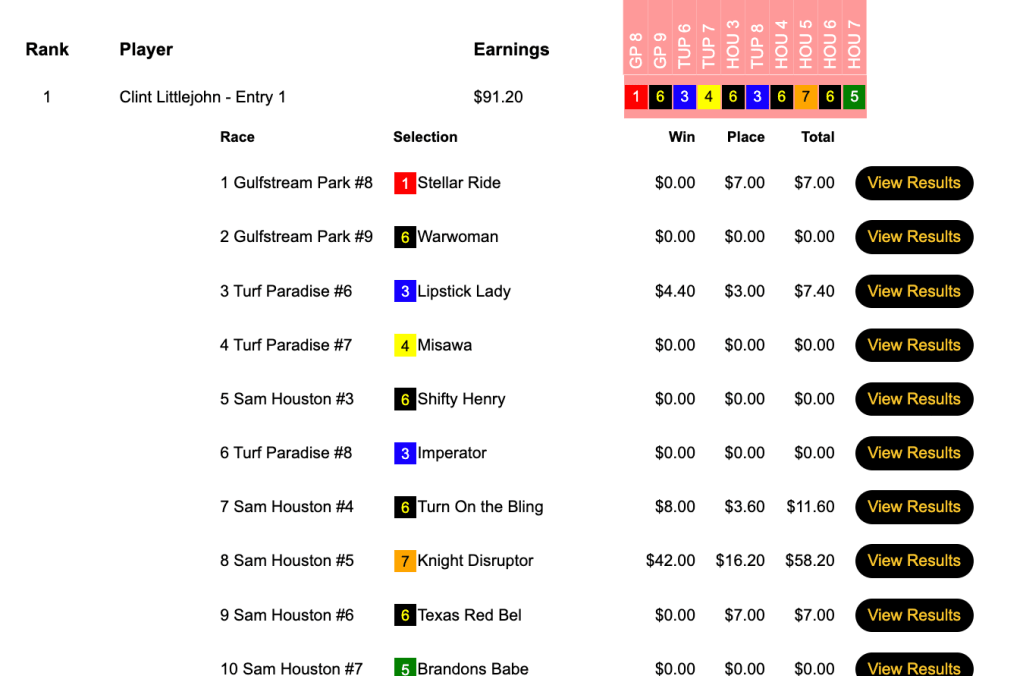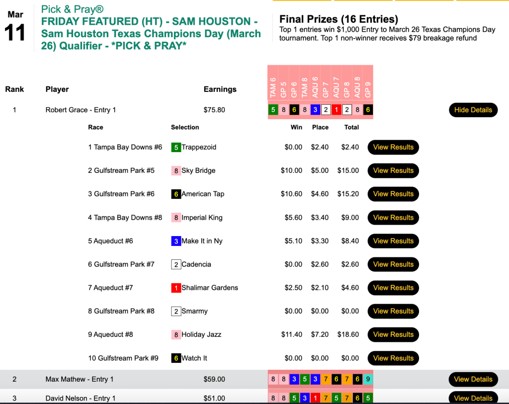 The end result was a 6-win, 2-place day and a $1,000 seat to the Sam Houston Texas Champions Day contest on March 26th.