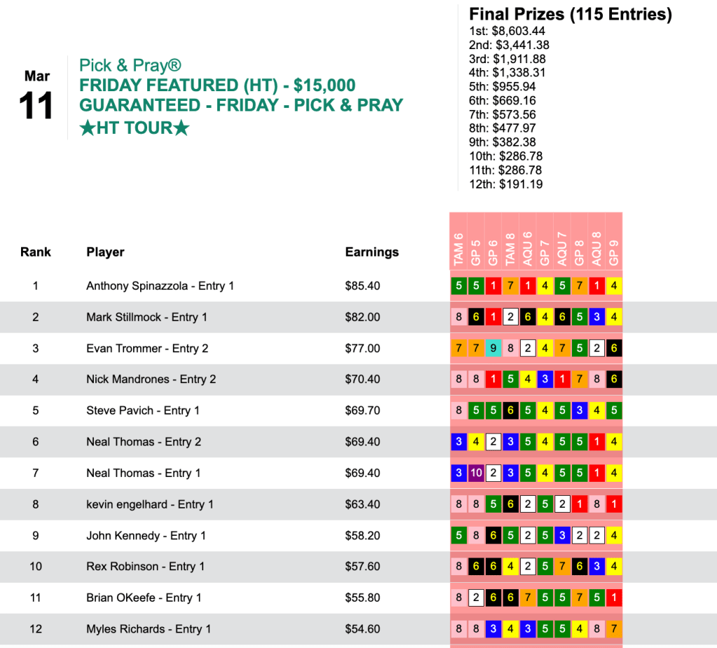 Spinazzola was the victor in Friday’s HT Tour event, our $15,000 Guaranteed Pick & Pray. He earned $8,603 from a total final pot of $19,118. Here was his scorecard: