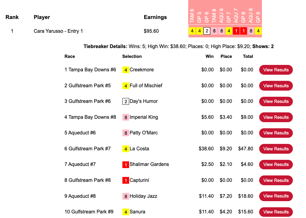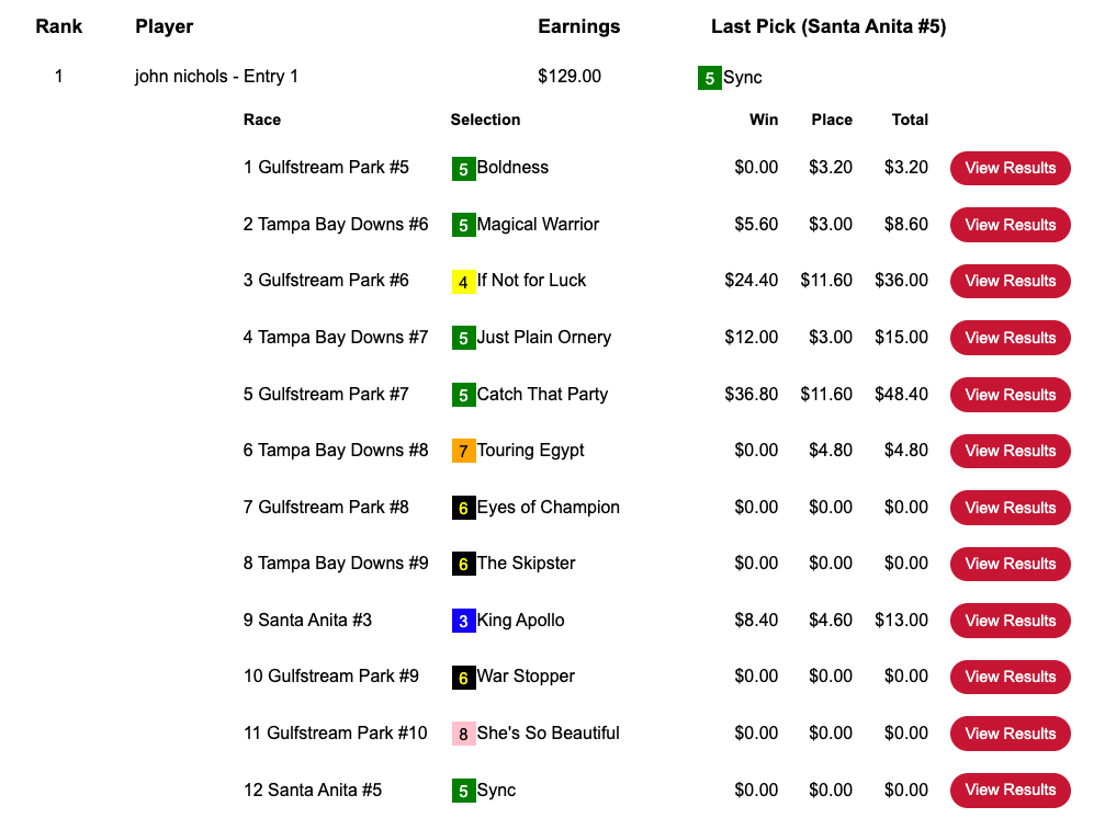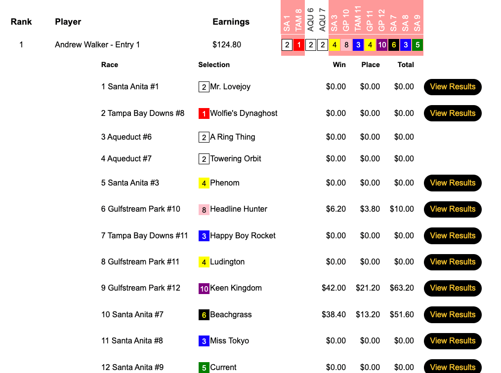 Nichols and fellow seat winner Brenton Schraff (5 wins, 1 place) both had If Not For Luck and Catch That Party, though the ride was a bit bumpier for Schraff. He failed to enter a selection for the first of the 12 contest races—due, we’re told, to confusion wrought by last weekend’s time change. And heading into the final race he found himself in 3rd place, still on the outside looking in. He was able to move into second place, however, by using the 1-5 winner (Thrive) of the final contest race…while his opponent had gone with an ultimately off-the-board 15-1 shot.