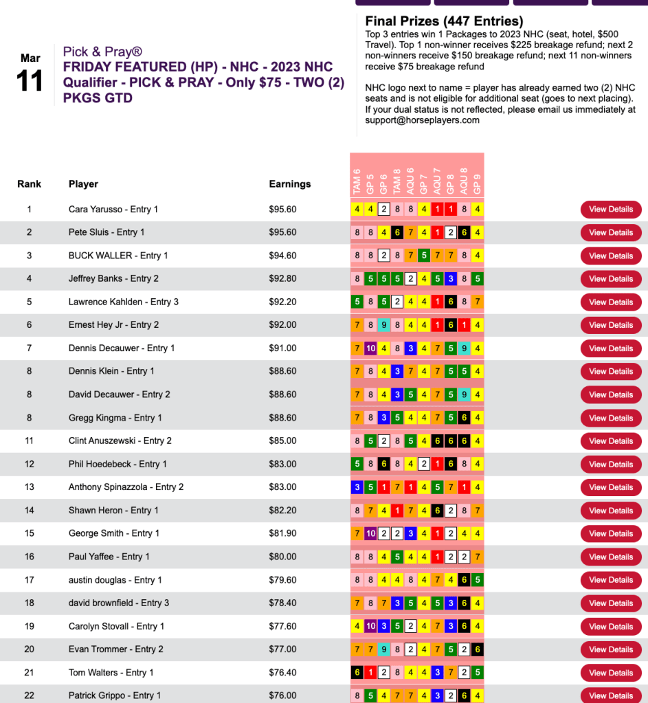 She parlayed her 5 winners into a low-cost NHC seat in Friday’s $75 qualifier at HorsePlayers.