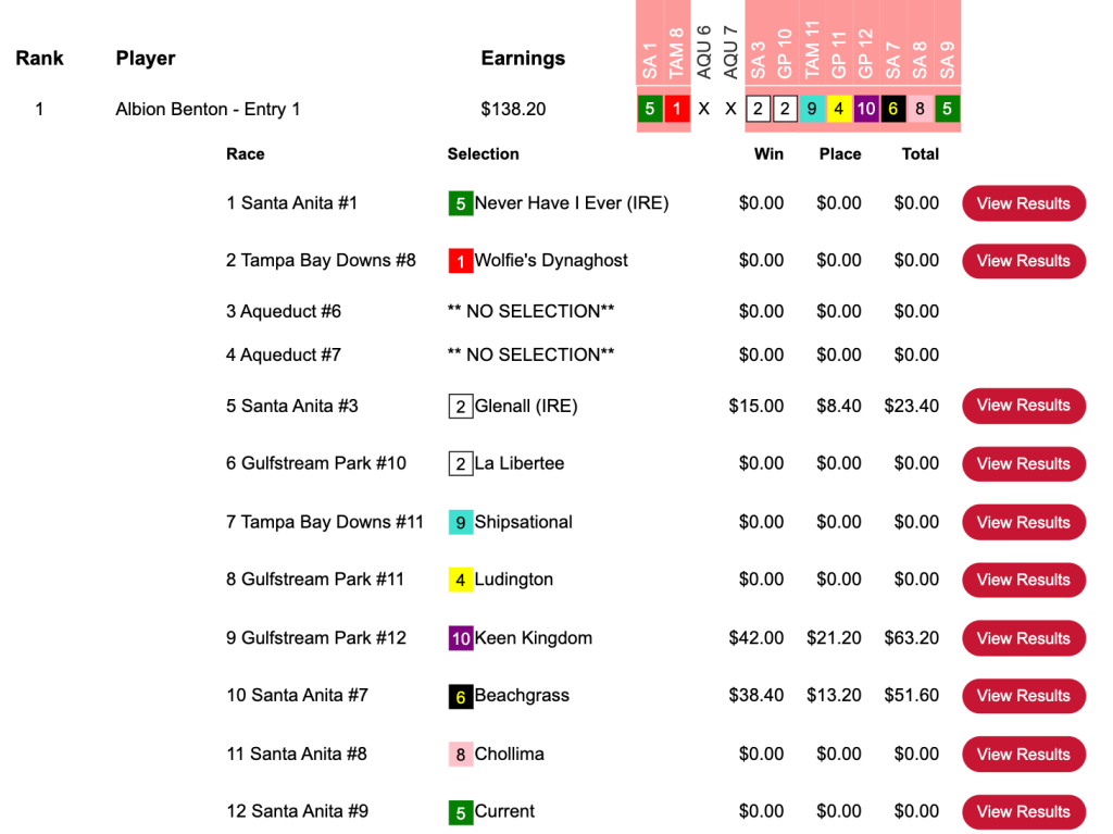 Benton and runner up Robert Fry had both of the day’s real prices—Keen Kingdom ($46.40, $21.20) in the 11th at Gulfstream and Beachgrass ($38.40, $13.20) in the 7th at Santa Anita. Matt Miller (5 winners) just had Beachgrass, but he came away with the third seat.