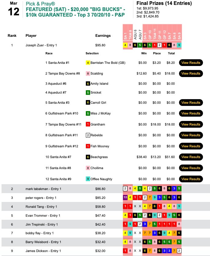 Zuer (3 wins, 1 place) had Beachgrass in the 7th at Santa Anita on the way to winning $9,973 in Saturday’s $10,000 Guaranteed Big Bucks game (final pot: $14,248).