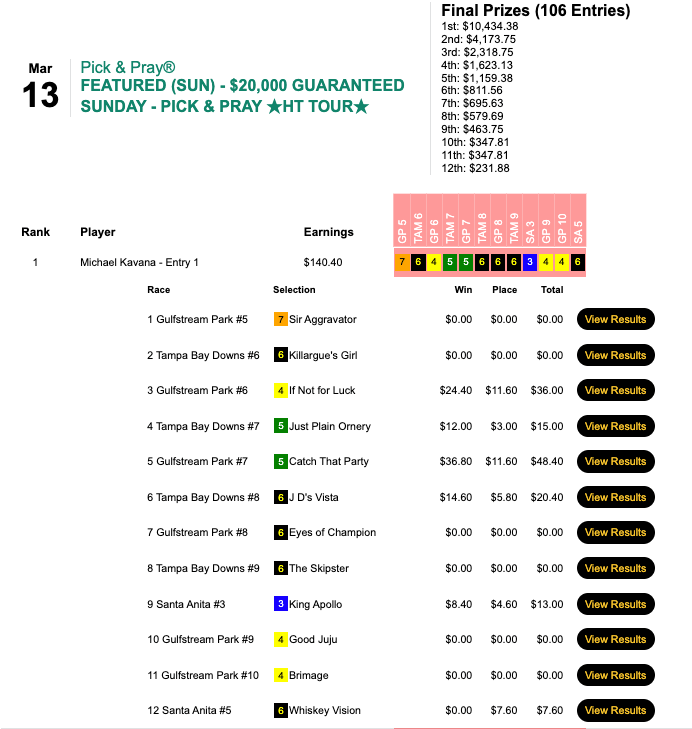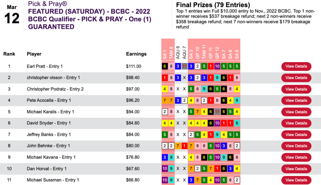 The other Saturday feature at HorsePlayers was a $179 Breeders’ Cup Betting Challenge Pick & Pray.