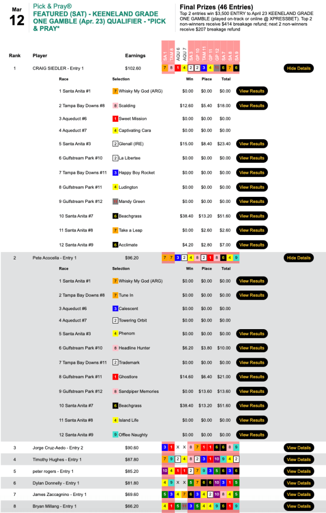 Donnelly only had 2 winners (and no places) on Sunday, but those winners were the day’s two best—If Not For Luck ($24.40, $11.60) in the 6th at Gulfstream and Catch That Party ($36.80, $11.60) in race 7 from the Hallandale, Fla., oval. Finishing second behind Donnelly in this Keeneland Grade One Gamble qualifier was John Kennedy, who, as noted earlier, also earned a Players Championship spot for finishing behind Joseph Zuer on this day.