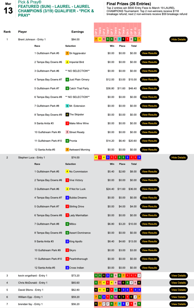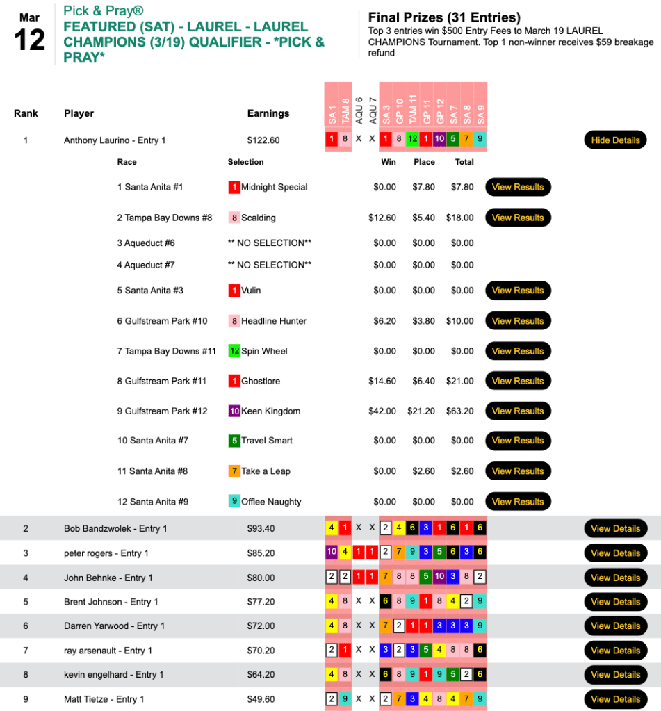The North Carolina resident can save the $500 entry fee (possibly to spend it on gas instead) thanks to his victory in Saturday’s Laurel qualifier. Laurino nailed 4 winners and 2 places. Also picking up Laurel berths were Bob Bandzwolek (4W, 1P) and Peter Rogers (3W, 1P).