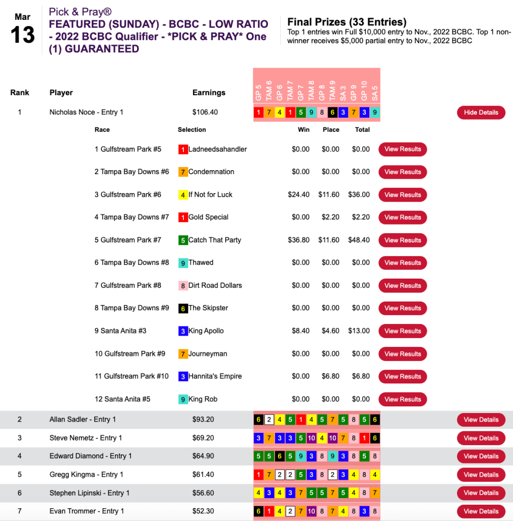 Those two plus one other winners and two places earned Noce a $10,000 Breeders’ Cup Betting Challenge entry in Sunday’s Low Ratio Pick & Pray at HorsePlayers.