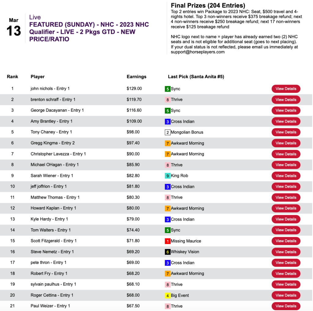 In the other Sunday feature at HorsePlayers, John “The Clocker” Nichols opened up with 6 consecutive cashes and went on to capture the day’s $125 NHC qualifier.