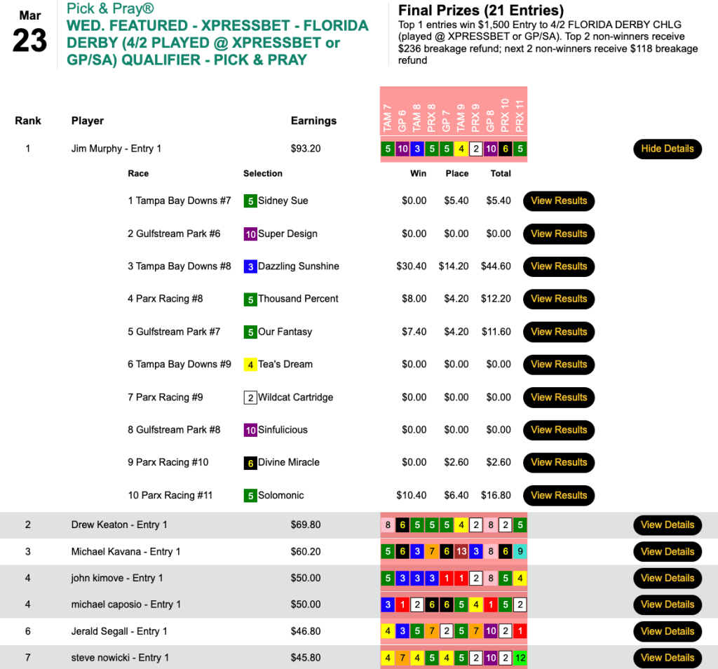 Trommer hit Lheea’s Joy ($10.20, $5.00) in the final contest race, the 12th at Tampa, to get up late and snag the up-top money of $6,411 in Sunday’s $7,500 Guaranteed Big Bucks Pick & Pray, which closed with a purse of $9,159.