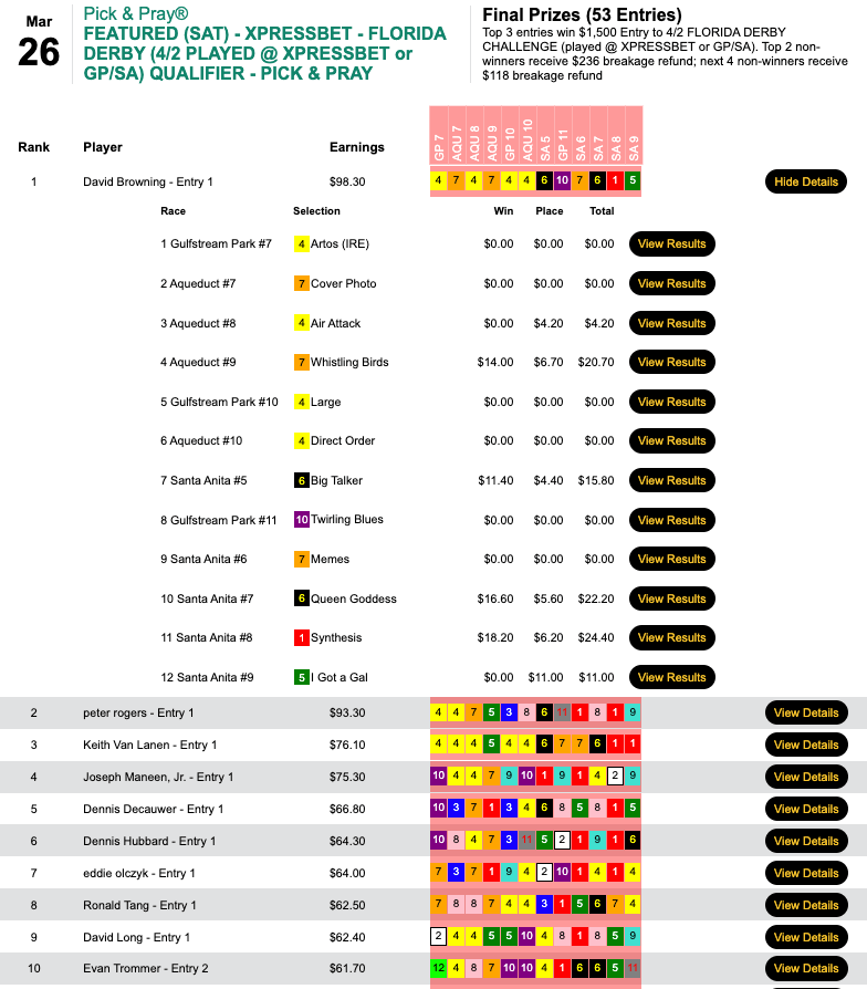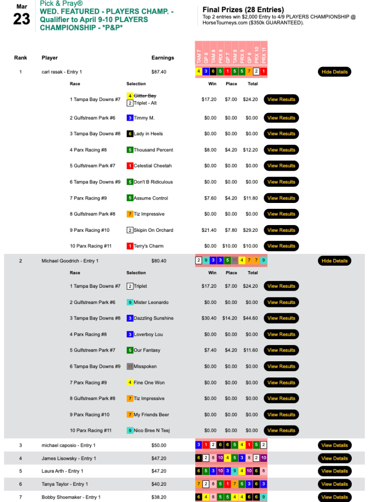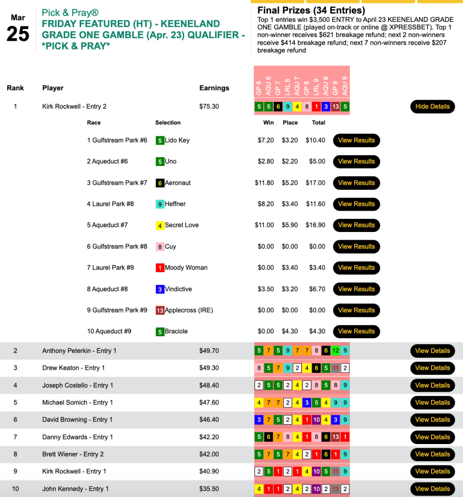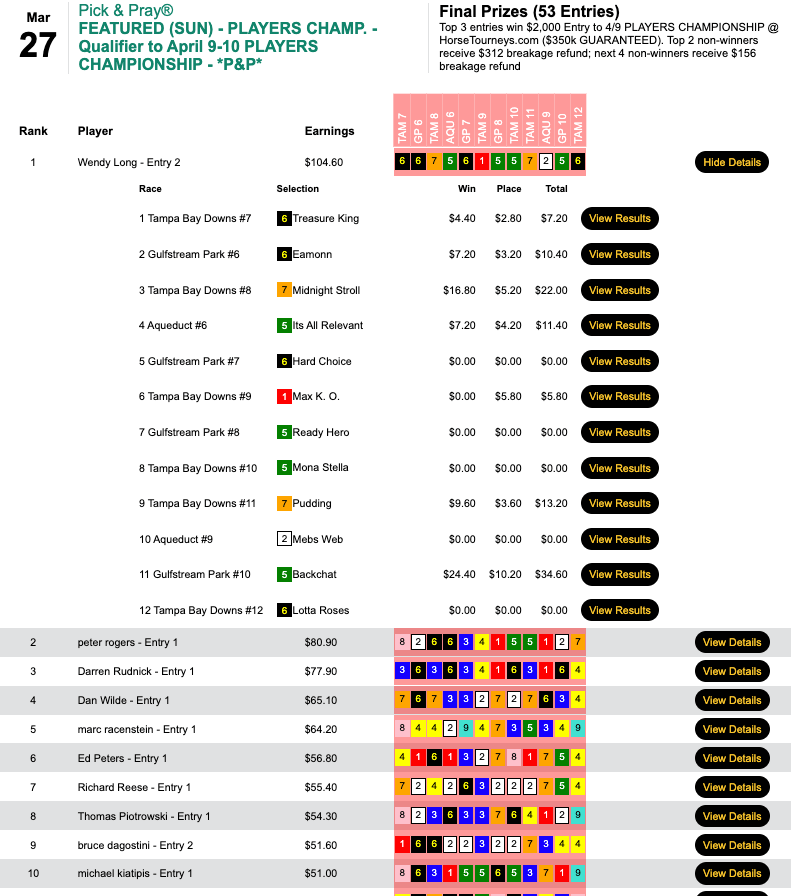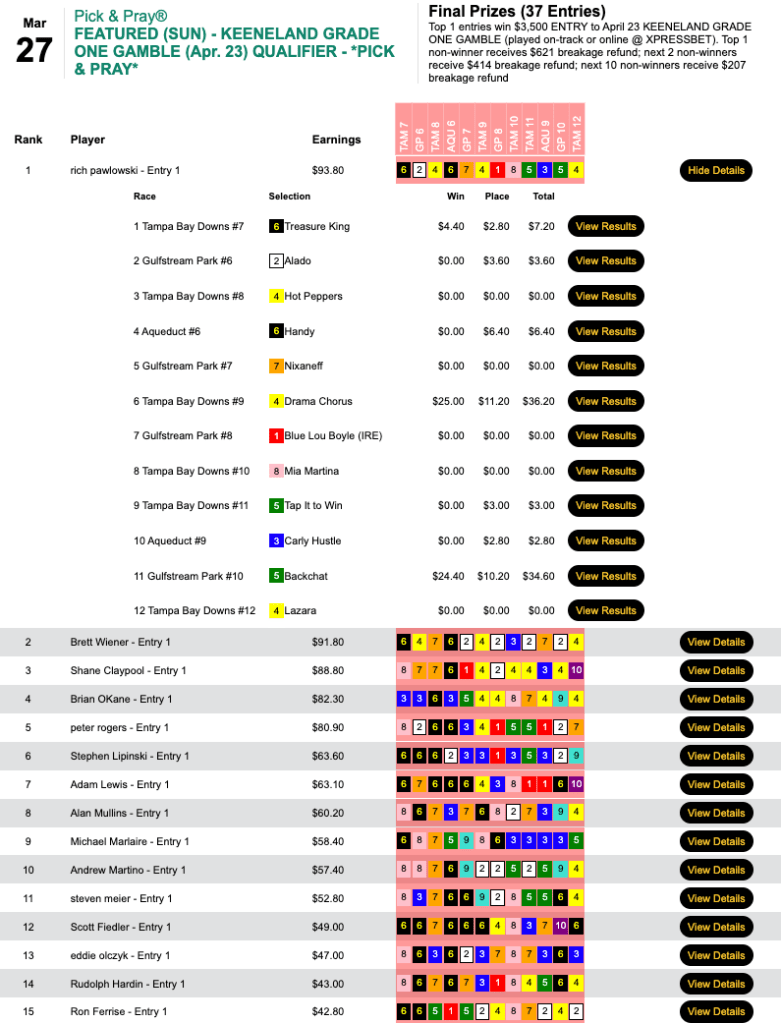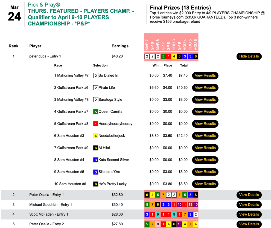 Duca (2 wins, 4 places) was the only entrant among 18 to turn a flat-bet profit, and that got him the $2,000 seat in Thursday’s qualifier to the $350,000 Guaranteed Players Championship on April 9-10. Duca’s biggest winner paid $8.80, so those four place payoffs aided his cause immensely.
