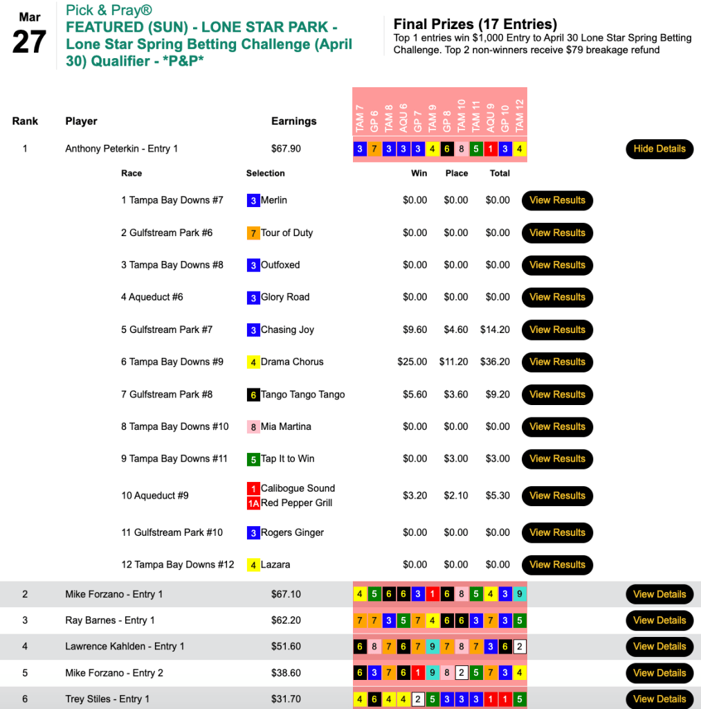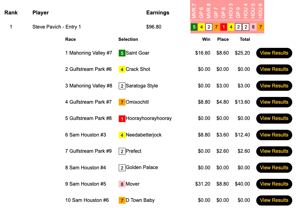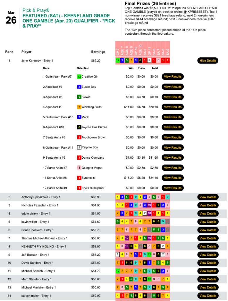Michael Solakis (4 wins, all in the final six races) and Anthony Spinazzola (3 wins, 2 places) got out of town with the $2,000 entries in this one. Spinazzola won his seat via tiebreaker over an unfortunate Michael Somich as a result of Spinazzola posting three winners to Somich’s two.