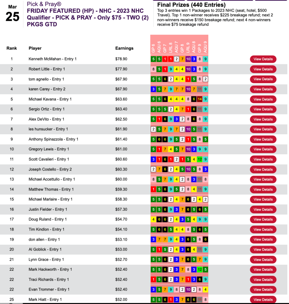 McMahan bested 439 opponents at HorsePlayers in Friday’s $75 NHC qualifier that also saw Robert Little (7 wins, 1 place) and Tom Agnello (5W, 2P) pick up 2023 seats.