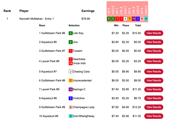 Loftus picked Lost Leaf ($11.20, $5.00) in the 7th at Gulfstream. That was the first of eight collections (4 wins and 4 places) that propelled him to success in Saturday’s Monmouth Pick Your Prize Pick & Pray.