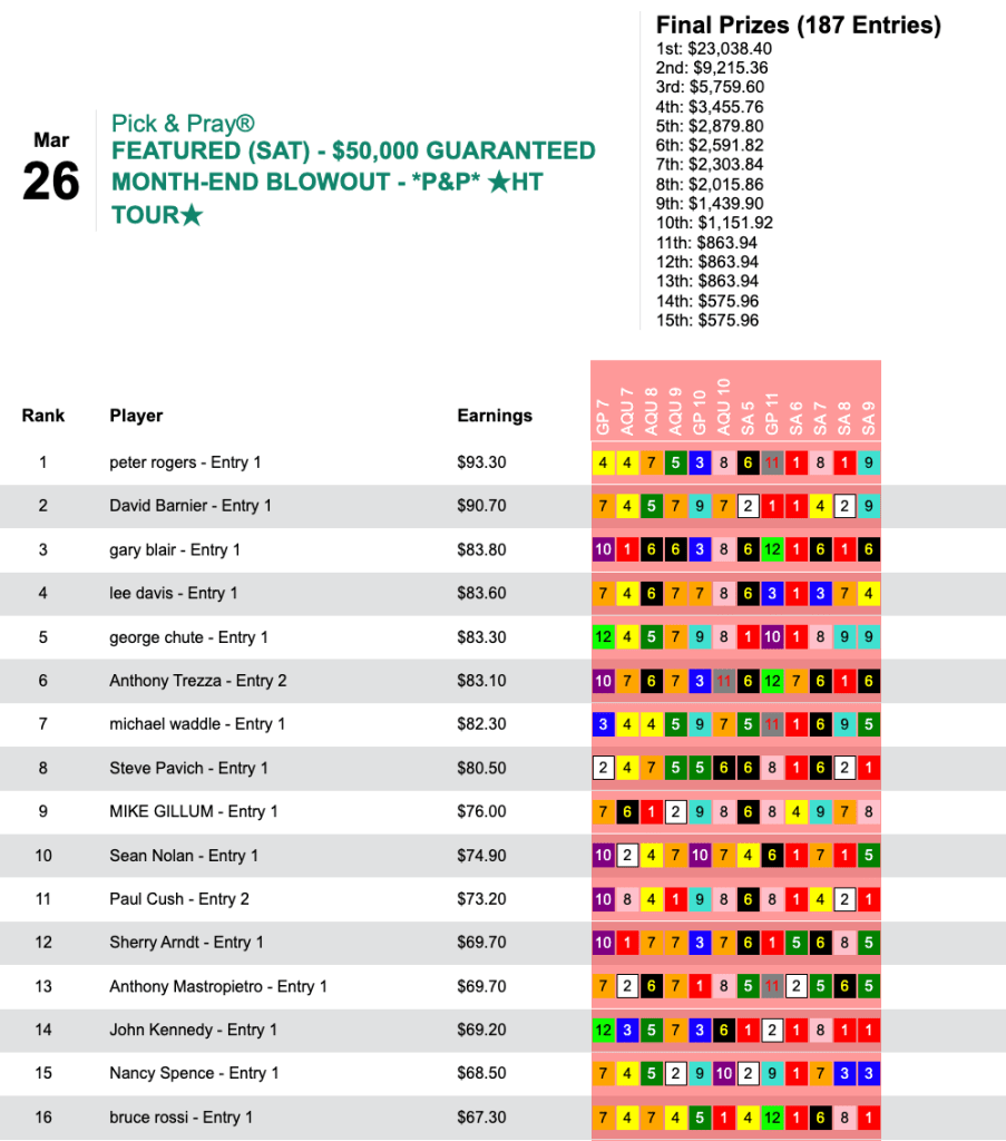 The first $50,000 Guaranteed Month-End Blowout was very well supported, and it offered a grand prize of $23,038 and an overall prize pool of $57,596. Rogers took the fattest part of the purse thanks to 5 wins and 3 places—and he made collections in each of the final seven contest races. Here was his Saturday scorecard:
