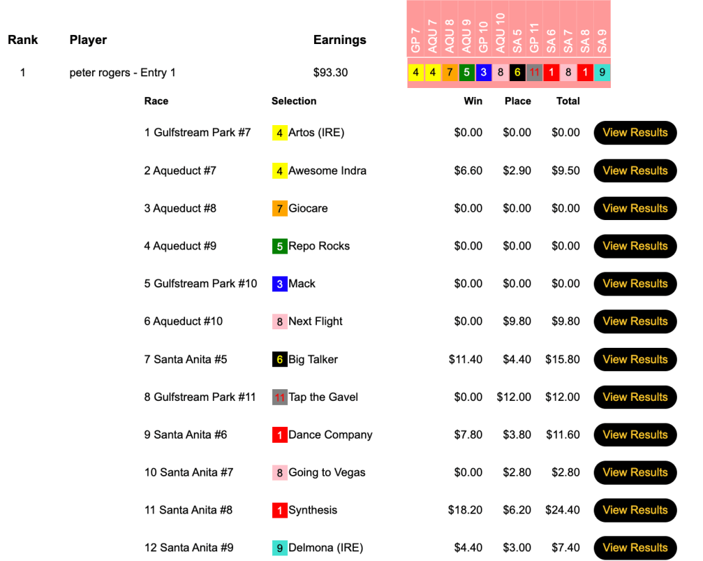 Here Rogers beat all but David Browning who put up the day’s highest score thanks to his having the day’s four longest-priced winners. Keith Van Lanen (4 wins, 1 place) also snared a $1,500 entry for running third. All three had Synthesis ($18.20, $6.20) in the 8th at Santa Anita.