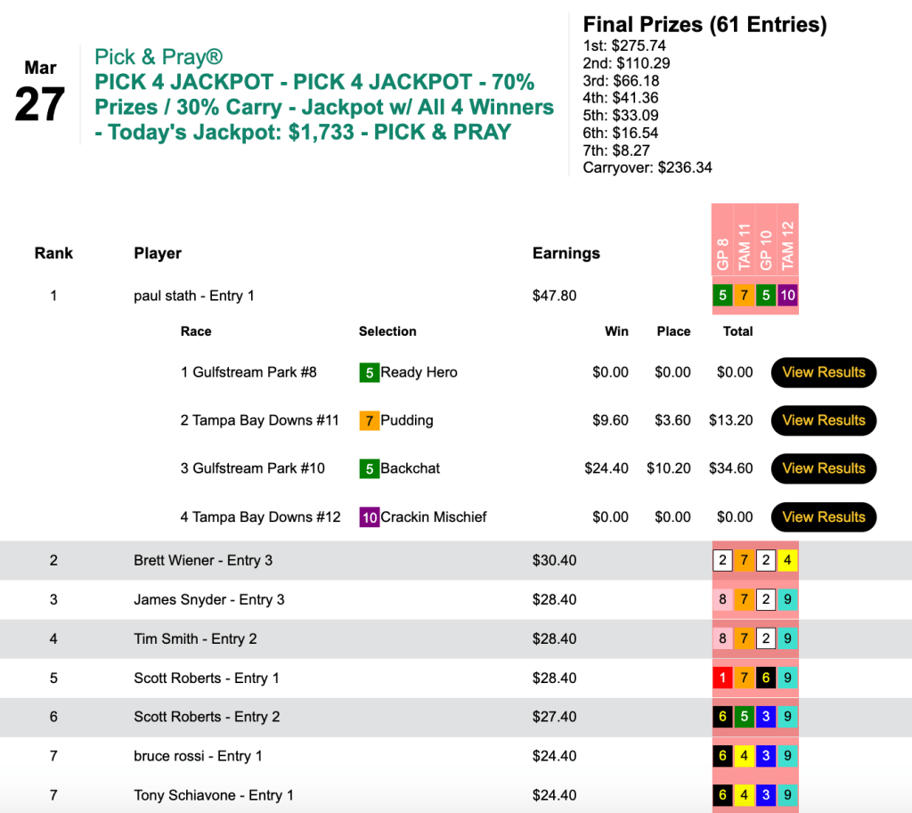 …managed to go a perfect 4-for-4 while taking their respective $15 Pick 4 Jackpot tourneys last weekend. So next Saturday’s Florida Derby Day $15 Pick 4 tourney will begin with $1,969 already in the kitty.