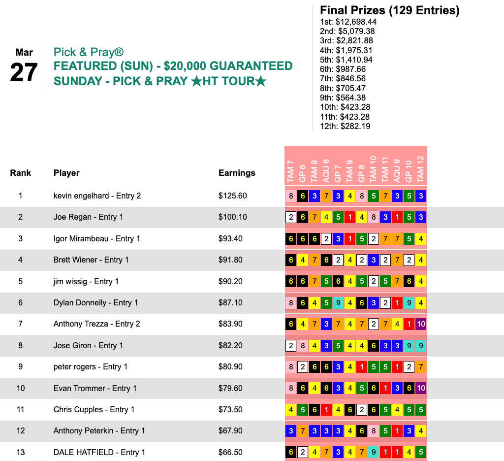 Sunday’s HT Tour event, our $20,000 Guaranteed Pick & Pray, was topped by Kevin Engelhard.