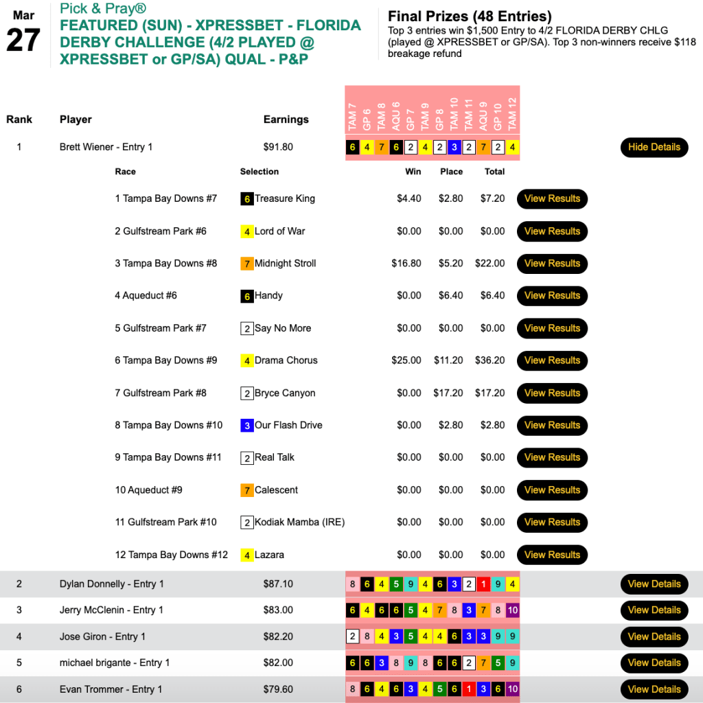 Using the same 3-win, 3-place picks that won him Sunday’s Monmouth Pick Your Prize qualifier, Wiener also finished on top in the Florida Derby Challenge play-in that also saw Dylan Donnelly (5W, 3P) and Jerry McClenin (3W, 3P) also exit with $1,500 berths for this Saturday. All three used Drama Chorus.