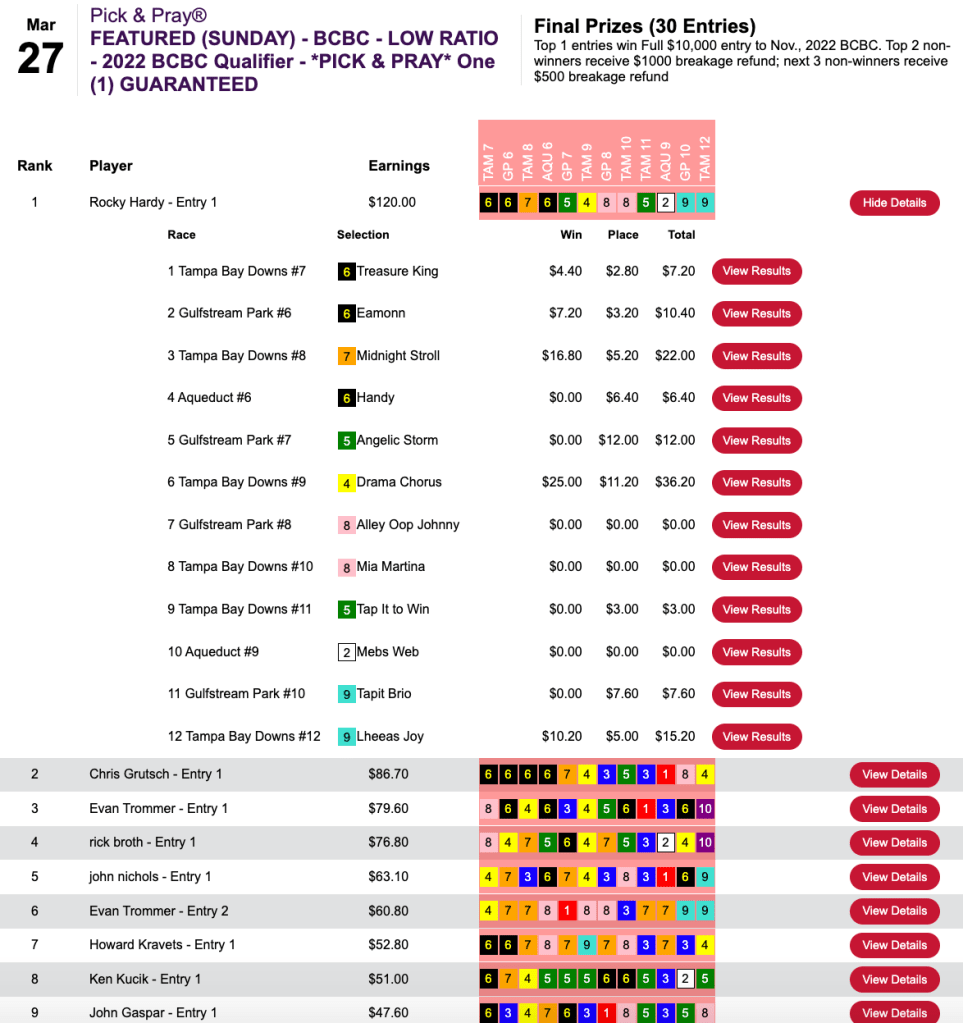 Over at HorsePlayers, Rocky Hardy made collections in each of the first six races and won Sunday’s Low Ratio Breeders’ Cup Betting Challenge Pick & Pray under wraps.