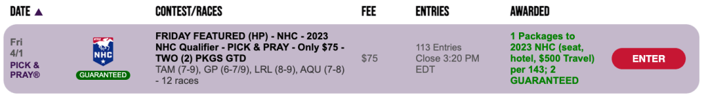 There are also daily qualifiers this weekend to the April 23 Keeneland Grade One Gamble and the June 4 Monmouth Pick Your Prize Challenge. Friday’s Grade One Gamble game is a $207, 1-per-20 Pick & Pray with winners garnering a $3,500 entry to the Keeneland battle.