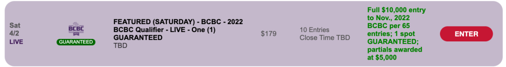 It’s a 1-per-65 qualifier with one $10,000 entry guaranteed to be awarded.. The format is Live and the entry fee is $179.