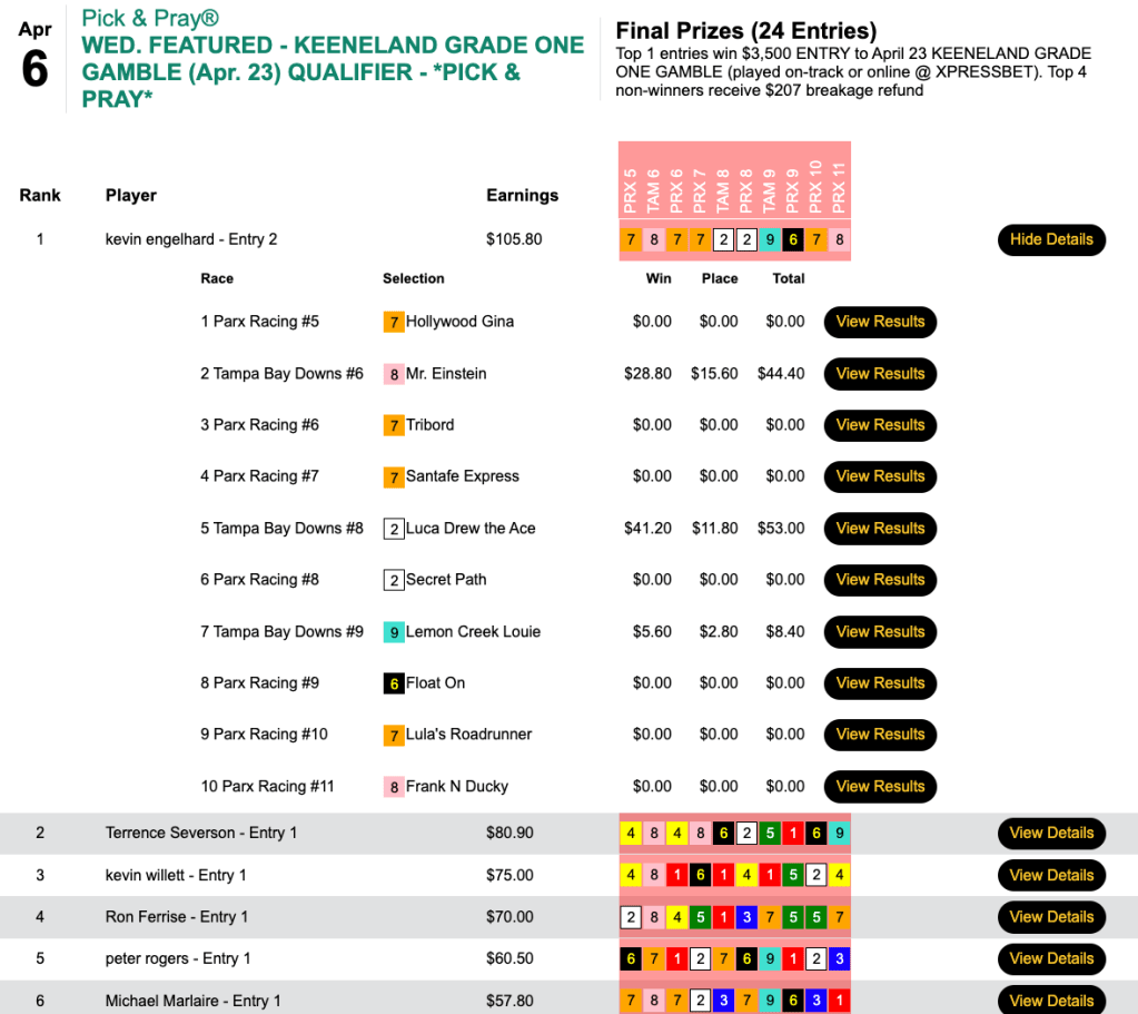 That one plus two other winners got Engelhard a $3,500 entry to the April 23rd Keeneland Grade One Gamble.