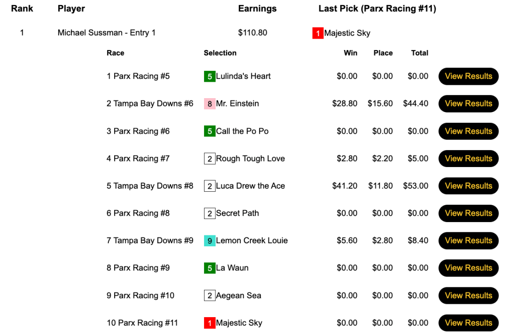The high score of the day was posted over at HorsePlayers by Michael Koblenz (5 wins, 2 places) in the NHC Pick & Pray.