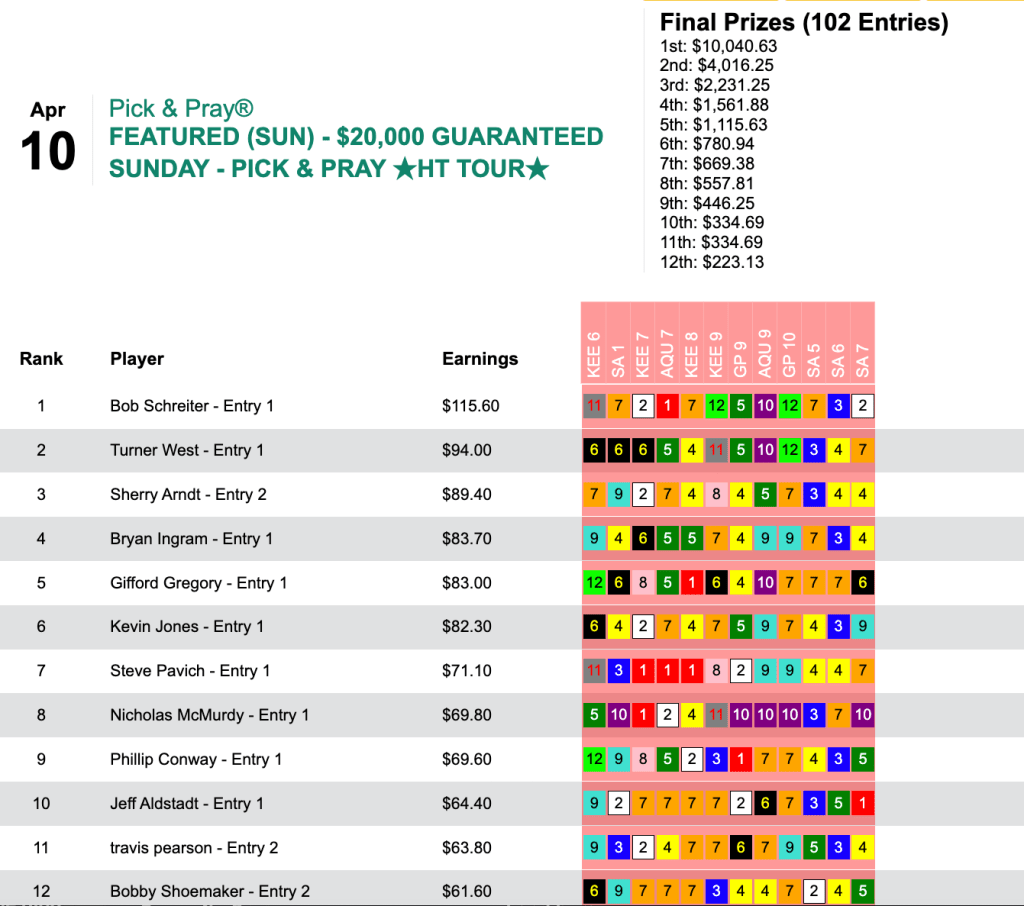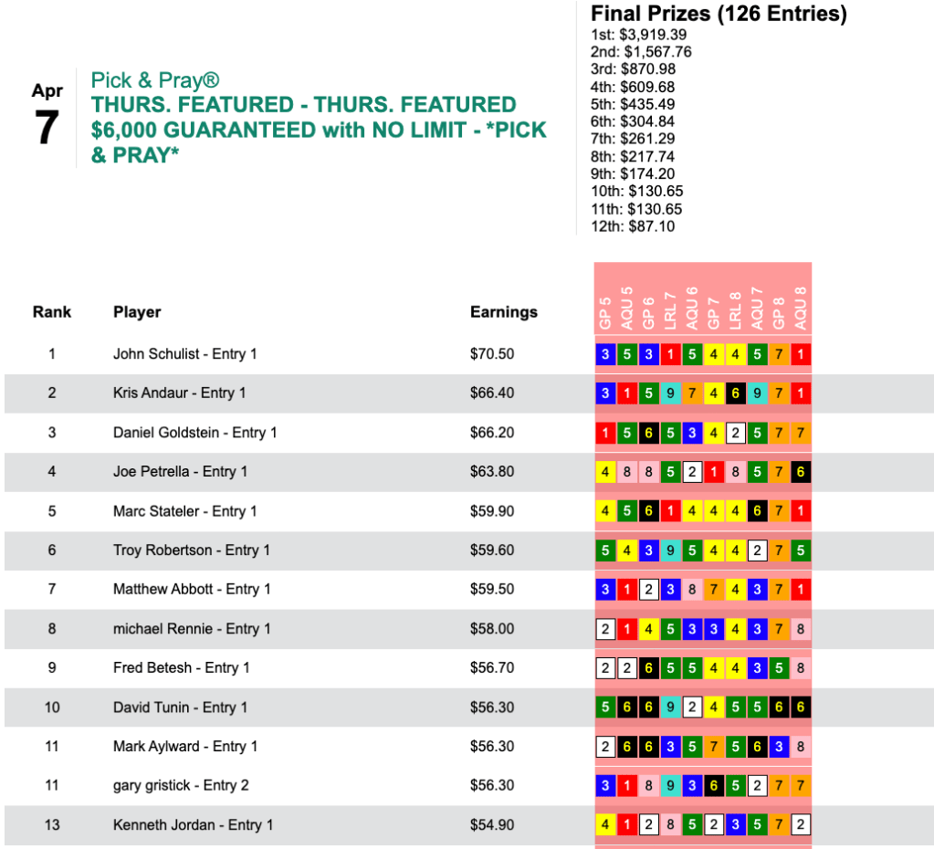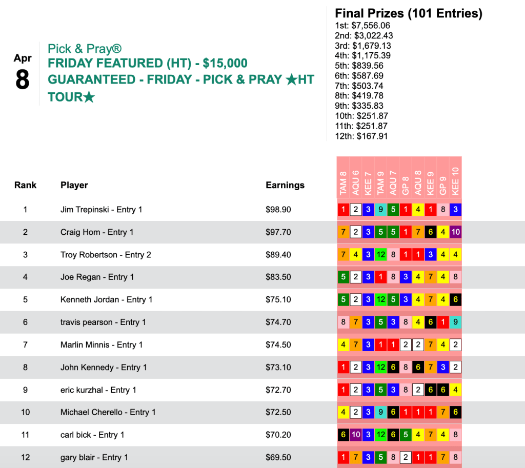 The 4-win, 1-place effort brought Trepinski a return of $7,556 in our $15,000 Gtd. Pick & Pray, which ended up with a pot of $16,791.