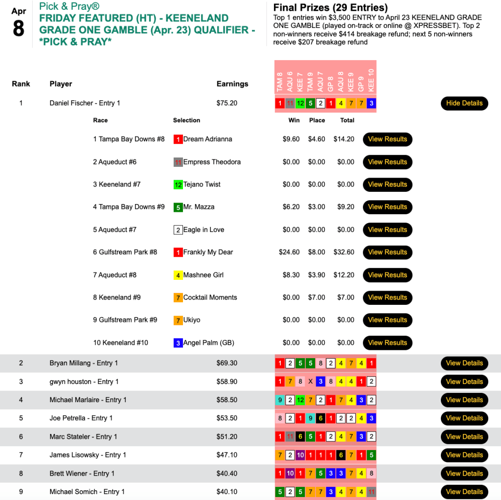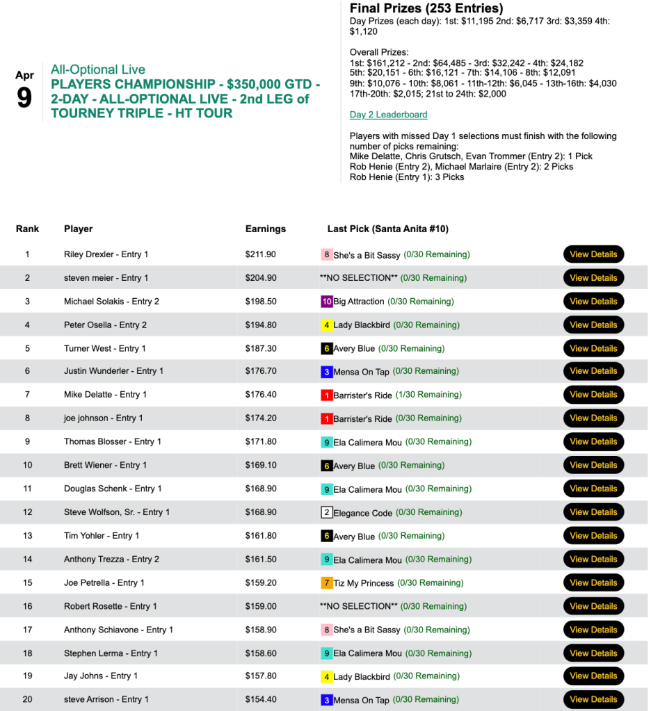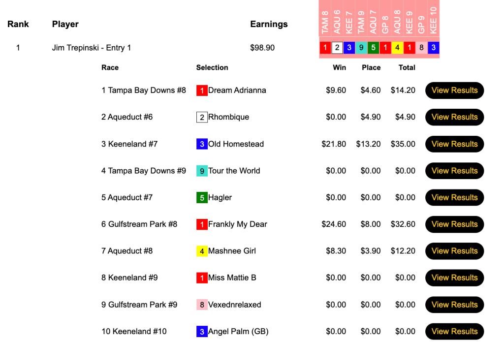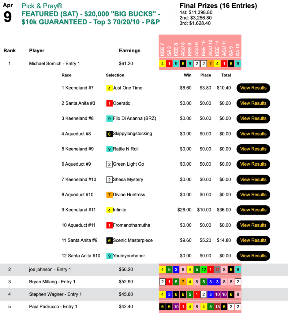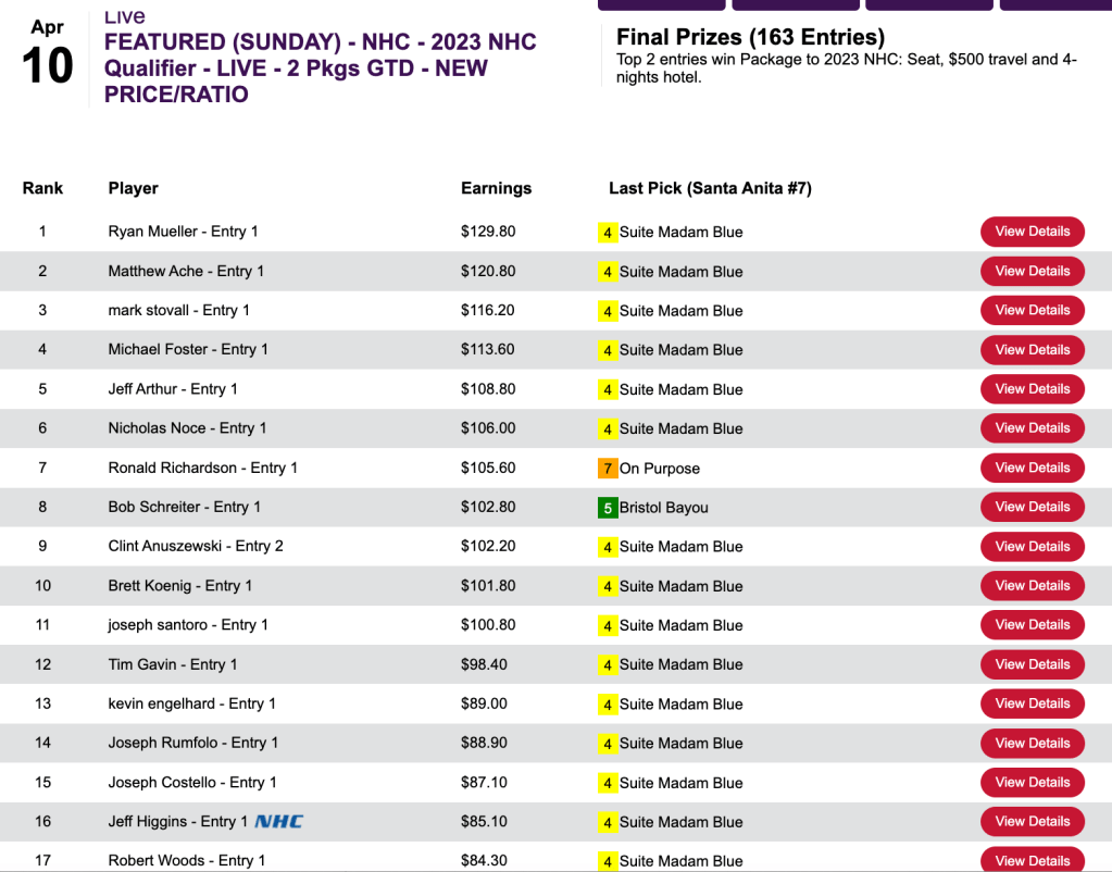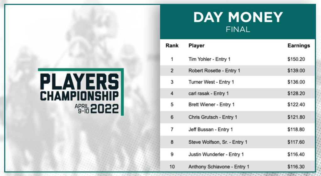 Thomas Blosser bagged $11,195 for leading at the end of Saturday. He had a late surge at the end provided by Power Surge, who blew up the tote in the 10th at Santa Anita, winning at 76-1. (Of the top three overall finishers, only Steven Meier had Power Surge.) If Blosser’s name seems familiar, it should be. He was the winner of the inaugural Flo-Cal Faceoff in 2020.