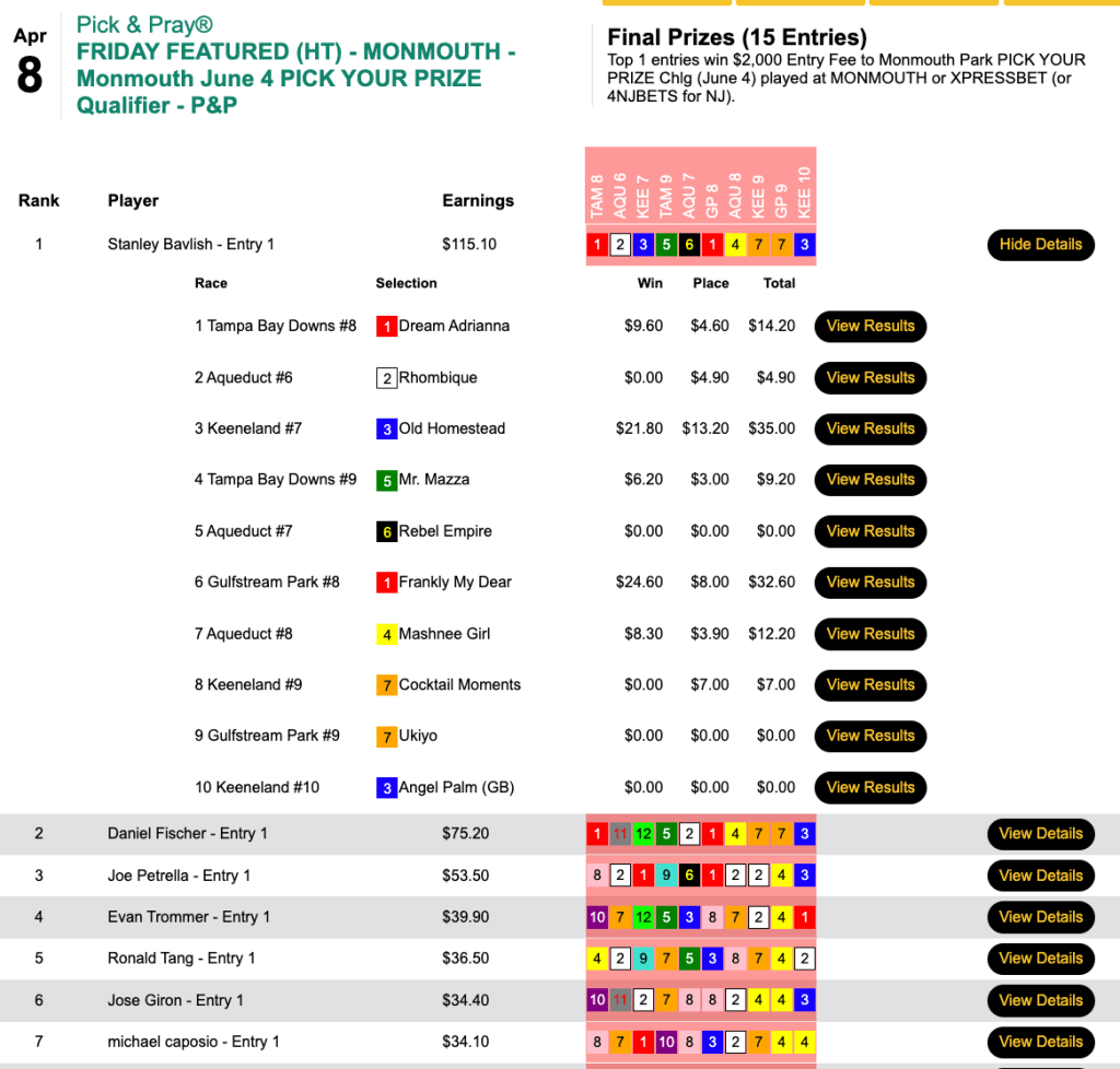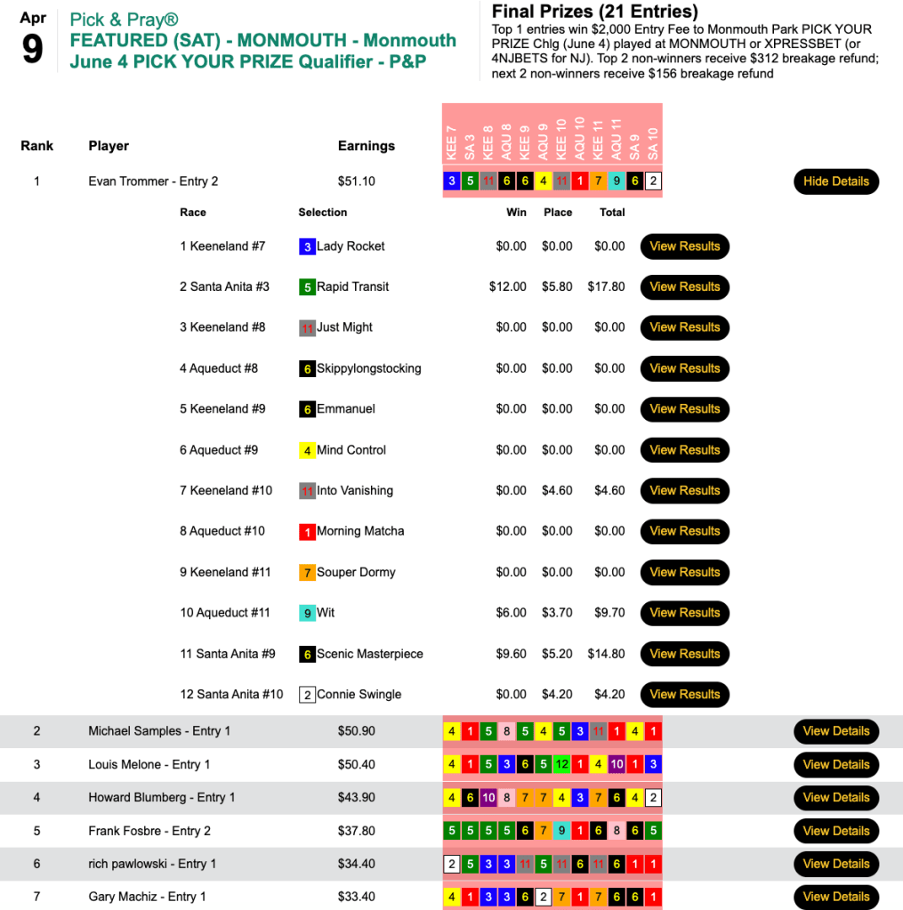 Evan Trommer (3 wins, 2 places) cashed in the final three races to secure his obligatory featured-tourney victory of the week in Saturday’s Monmouth Pick Your Prize qualifier.