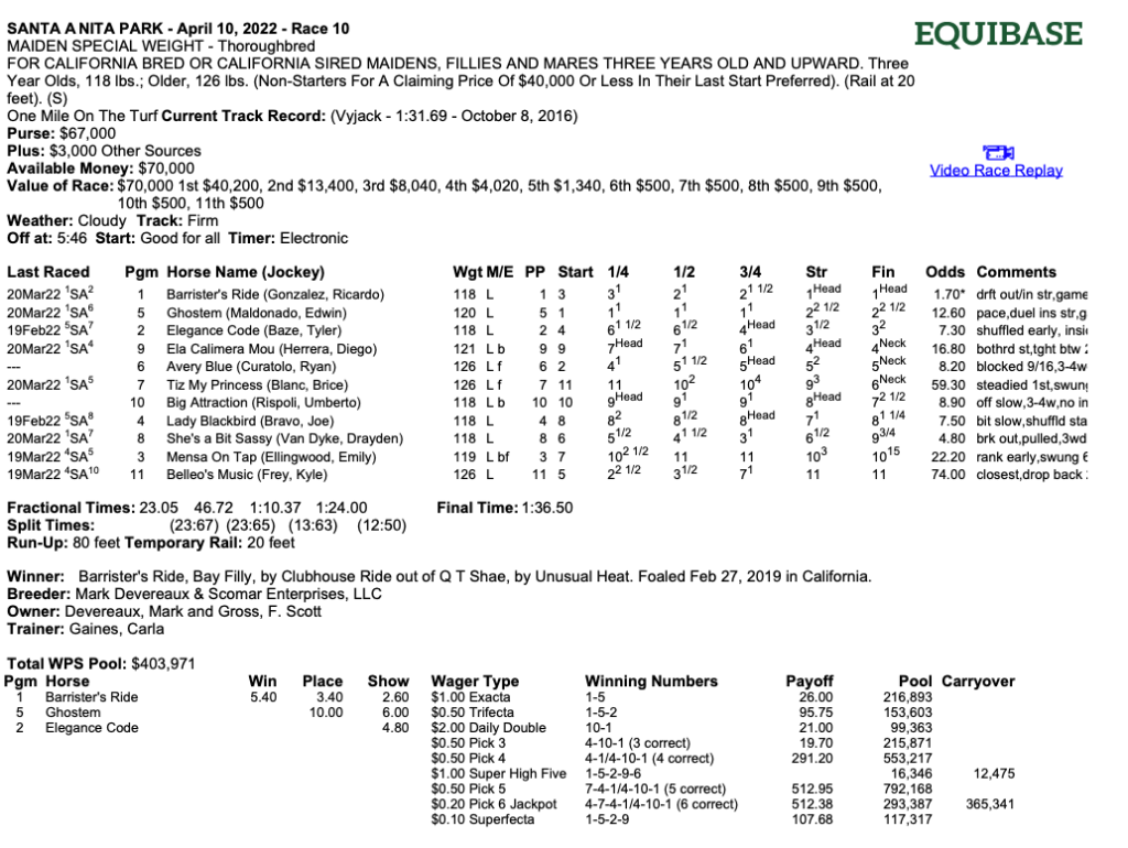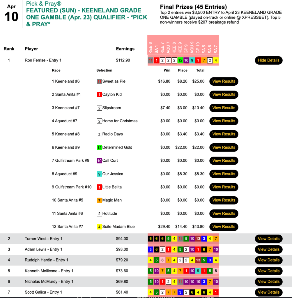 Of course, it always helps when you catch a 76-1 horse. “Captain” Frank Sorensen also had cap horse Power Surge in the 10th at Santa Anita, and he will join Ferrise in the Keeneland Grade One Gamble on April 23rd.