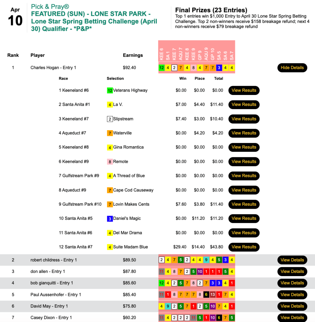 The 13-1 victor came in the final contest race, the 7th at Santa Anita, and it rewarded Hogan (4 wins, 2 places) with a $1,000 entry into the April 30 Lone Star Spring Betting Challenge.