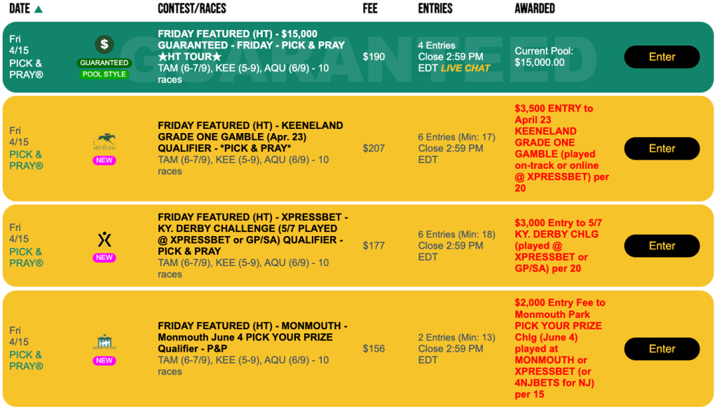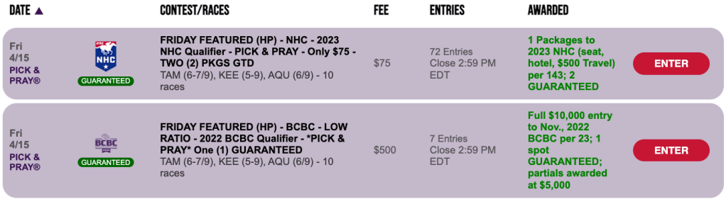 There are also daily qualifiers this weekend to the April 23 Keeneland Grade One Gamble, the May 7 Kentucky Derby Challenge and the June 4 Monmouth Pick Your Prize Challenge. Friday’s Grade One Gamble play-in is a $207, 1-per-20 Pick & Pray with winners grabbing a $3,500 entry to the Keeneland game (which can also be played at Xpressbet).