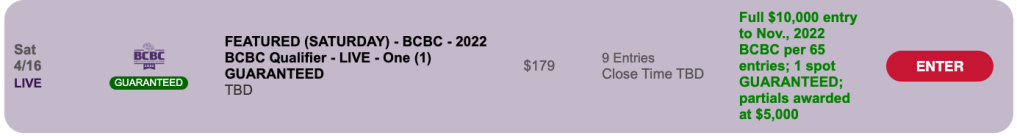 It’s a Live-format, 1-per-65 square off with one $10,000 entry guaranteed and an entry fee of $179.