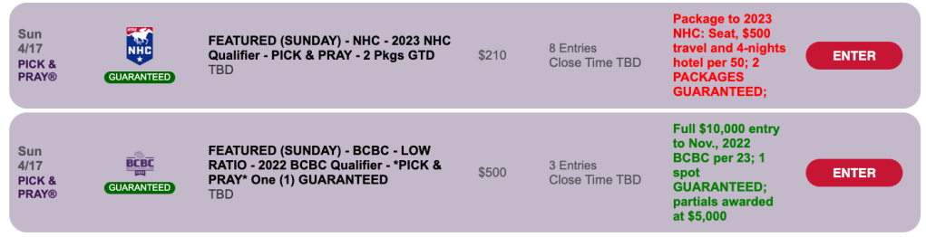 The Sunday NHC Pick & Pray carries a $210 buy-in. At least two spots will definitely be awarded, and the winning ratio is 1-in-50.