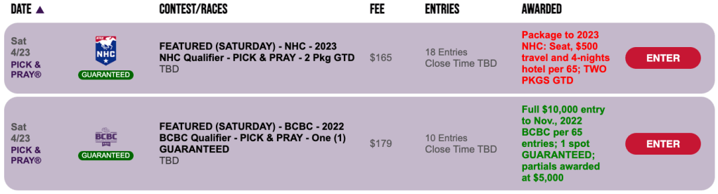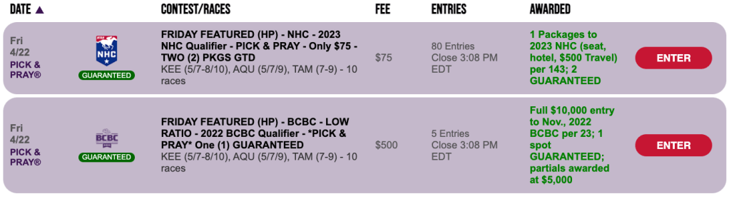 Another Friday Pick & Pray qualifier is that for The Kentucky Derby Challenge on May 7. Seats are worth $3,000 each, but you can get one for $177 in Friday’s 1-per-20 Pick & Pray. The Derby Challenge can be played at Gulfstream, Santa Anita or Xpressbet.