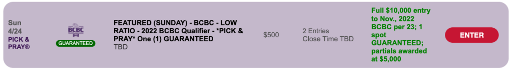 It’s a $500 Low Ratio Pick & Pray. One $10,000 seat is guaranteed, and the winning ratio will be 1-per-23.