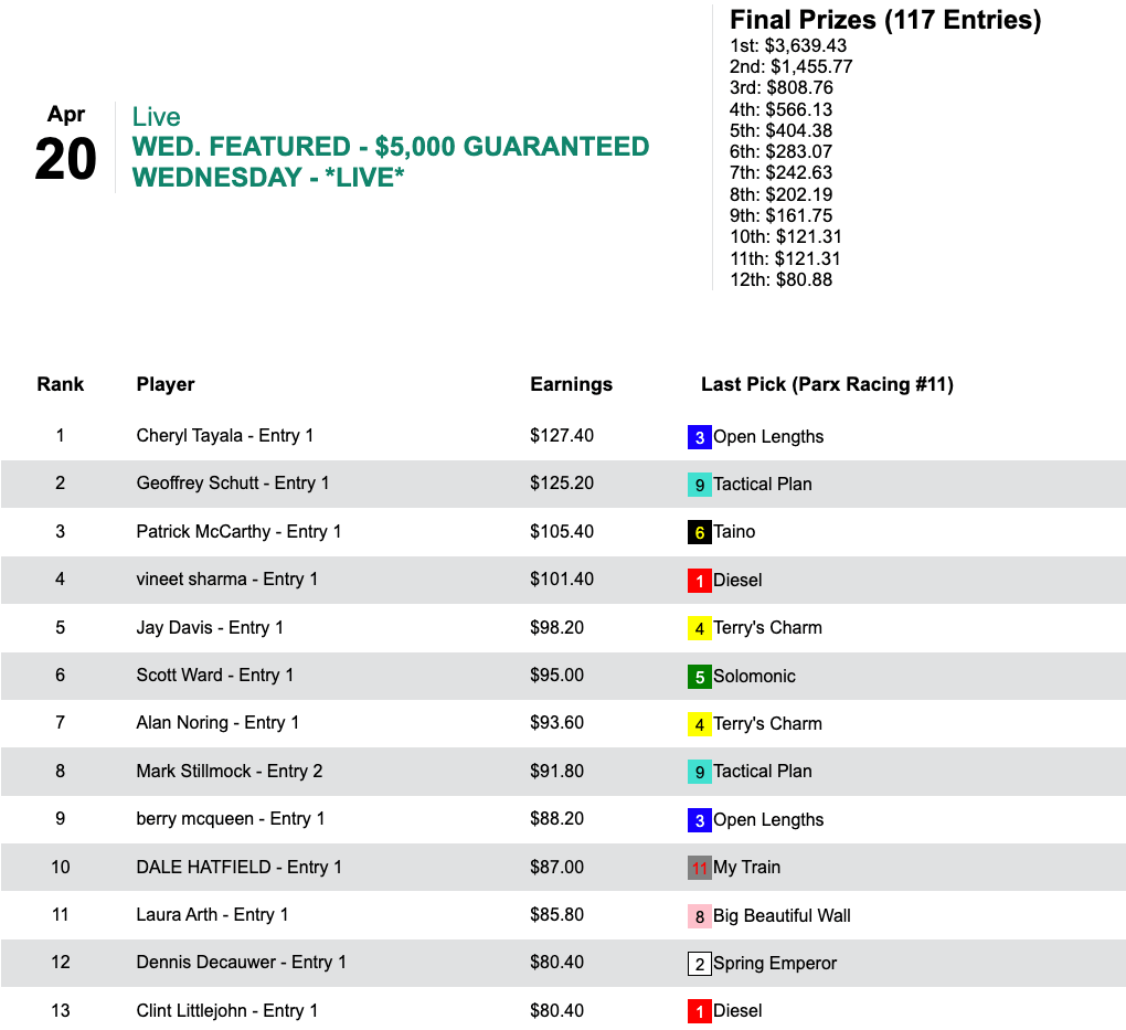 Cheryl Tayala picked 3 winners, including Marquet Malice ($56.40, $23.80) in the 7th at Tampa and Twisted Treasure ($25.00, $12.40) an hour later in the 9th at Tampa, to take home $3,639 in Wednesday’s $5,000 Guaranteed tourney, which settled its books with a final purse of $8,087. Here was her scorecard: