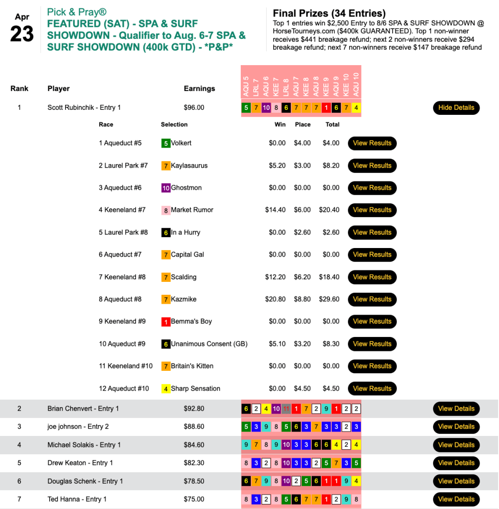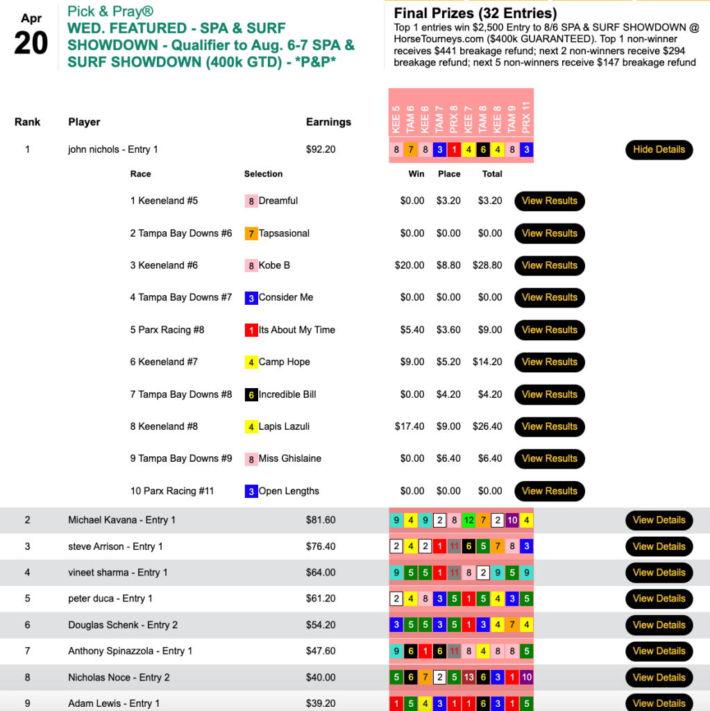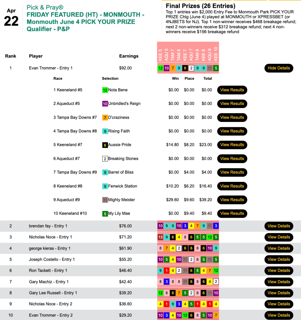 Trommer doped out 3 wins and 2 places to earn a $2,000 Monmouth Pick Your Prize seat for June 4th. And the Floridian played those same picks back in Friday’s Spa & Surf Showdown qualifier.