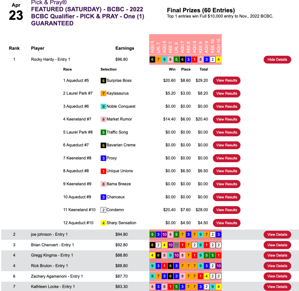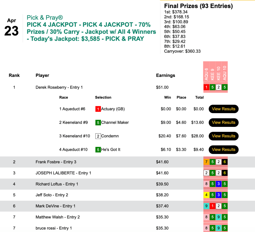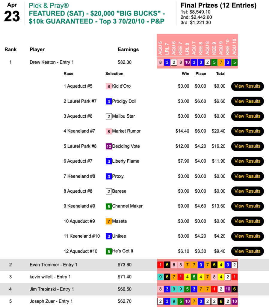 Having He’s Got It ($6.10, $3.30) elevated from 2nd to 1st via DQ at the end got Keaton up and into first place at the conclusion of Saturday’s $10,000 Guaranteed Big Bucks Pick & Pray. He bagged $8,549 from a total final prize pool of $12,213.