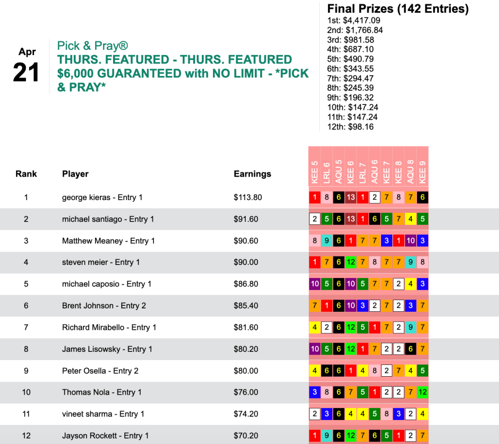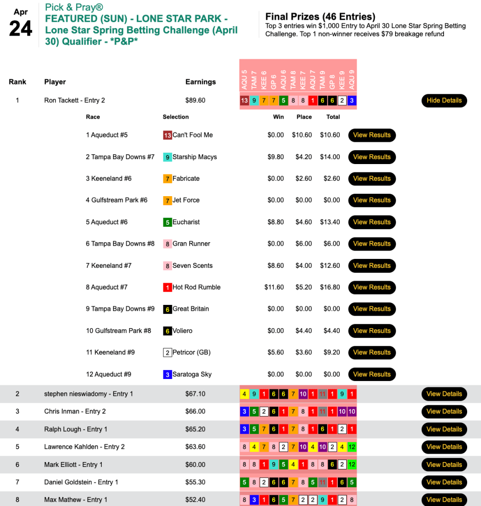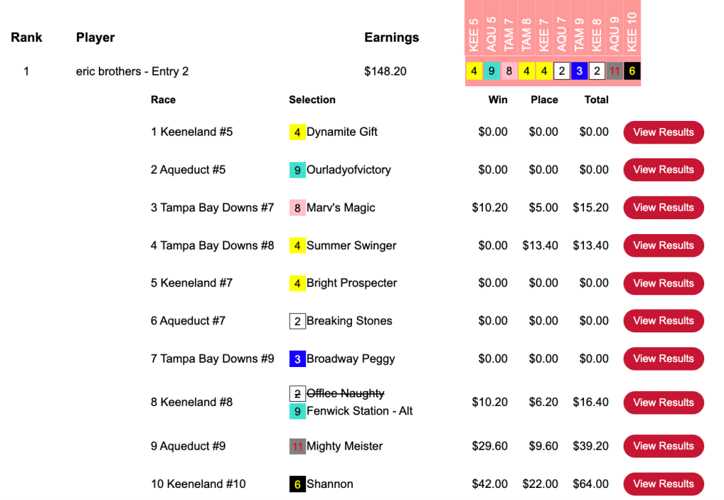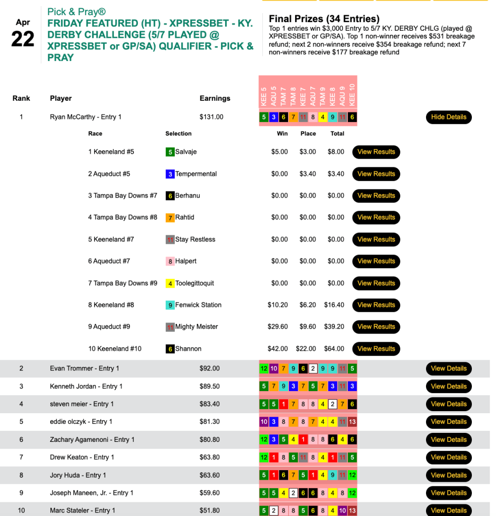 Having He’s Got It ($6.10, $3.30) elevated from 2nd to 1st via DQ at the end got Keaton up and into first place at the conclusion of Saturday’s $10,000 Guaranteed Big Bucks Pick & Pray. He bagged $8,549 from a total final prize pool of $12,213.