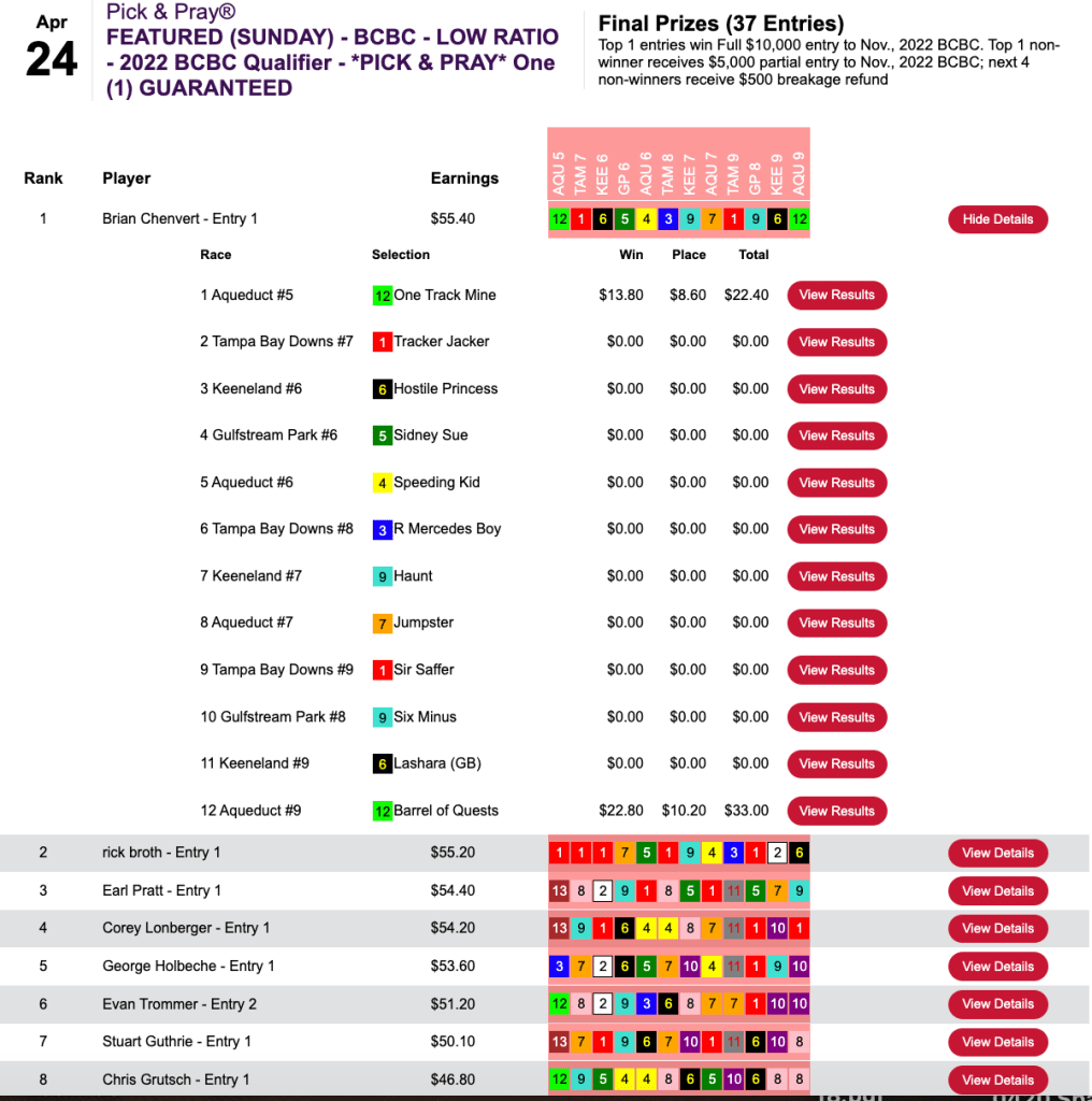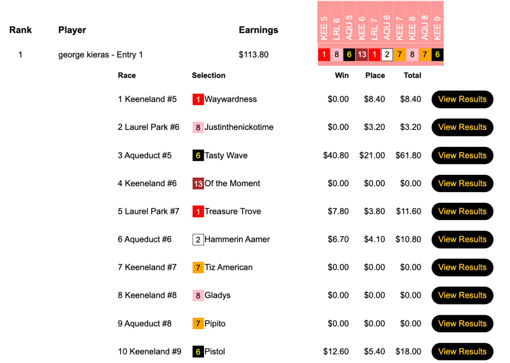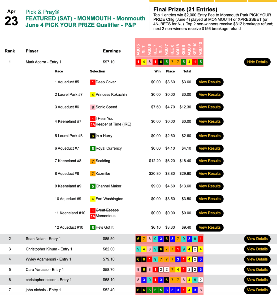 Christopher Kinum (3 wins, 2 places) certainly spotted himself well in Sunday’s Monmouth Pick Your Prize qualifier. None of the 16 entrants managed to turn a flat-bet profit. That meant that Kinum, with a final score of $39.90 and a top-priced winner of $7.40, carried the day—and carried home the $2,000 seat for June 4th.