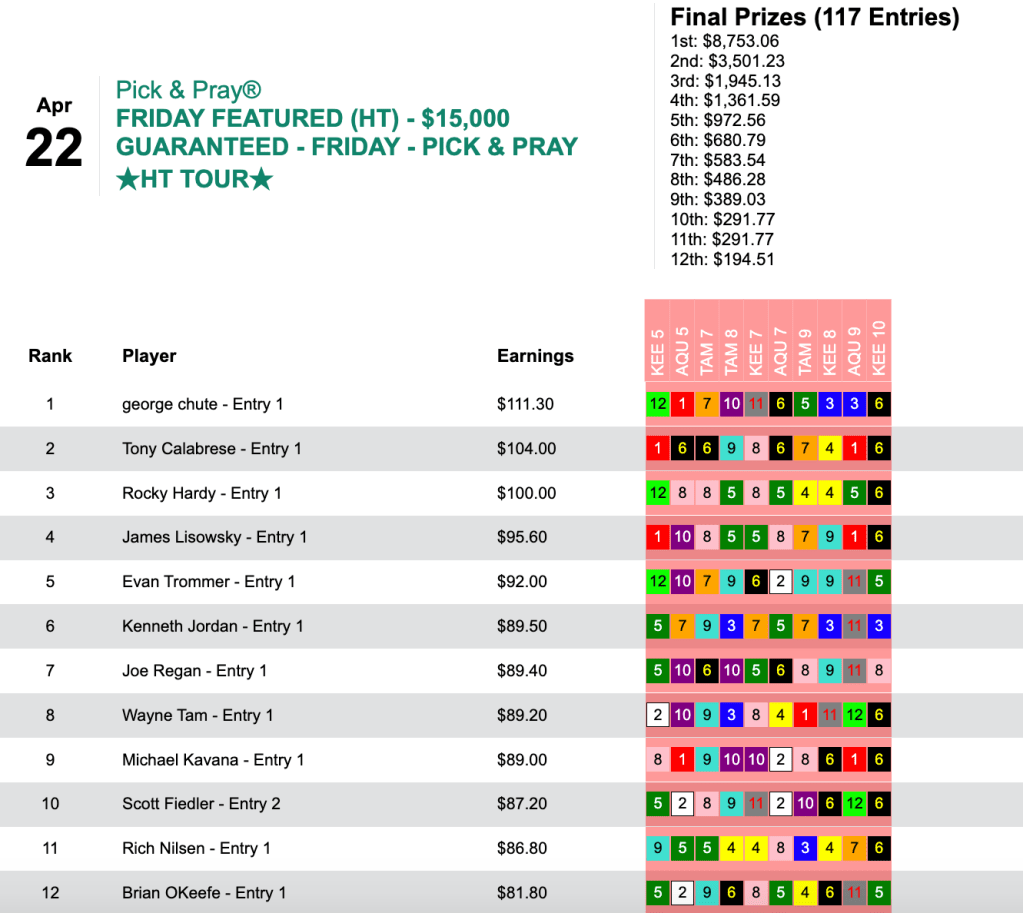 Shannon was the last and best of 4 winners (plus a place) for the Bay Stater on the way to a payday of $8,753 in Friday’s HT Tour event, our $15,000 Guaranteed Pick & Pray, which paid out a total of $19,451.