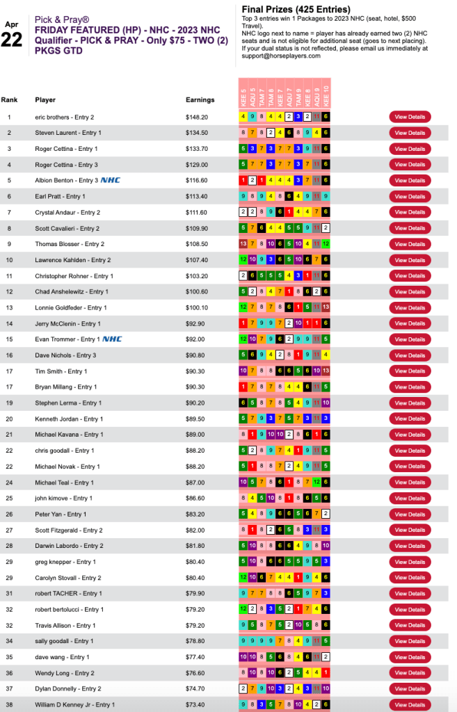 Brothers nailed the final three races to finish with 4 wins and a place and lead the way in Friday’s $75 NHC qualifier at HorsePlayers.