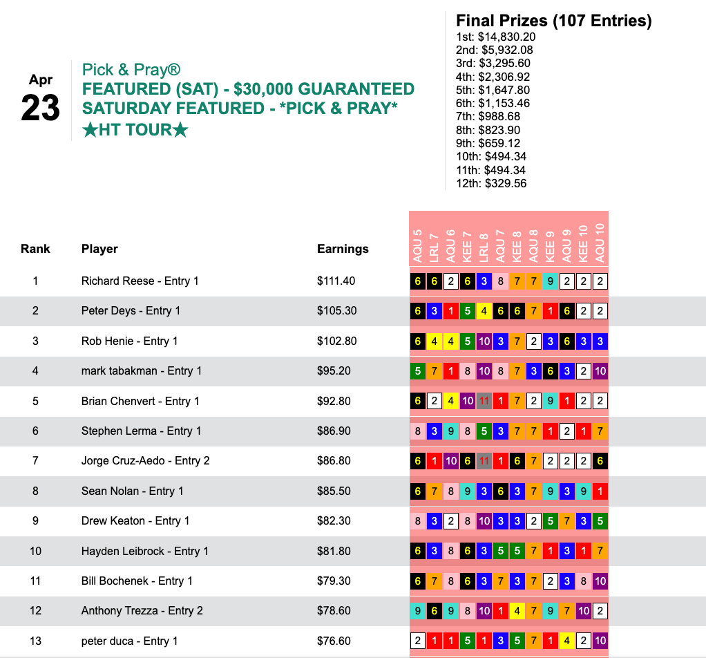 He earned $14,830 in the weekend’s richest tourney, our $30,000 Guaranteed Pick & Pray, which served as the day’s HT Tour contest and closed with a purse of $32,956.