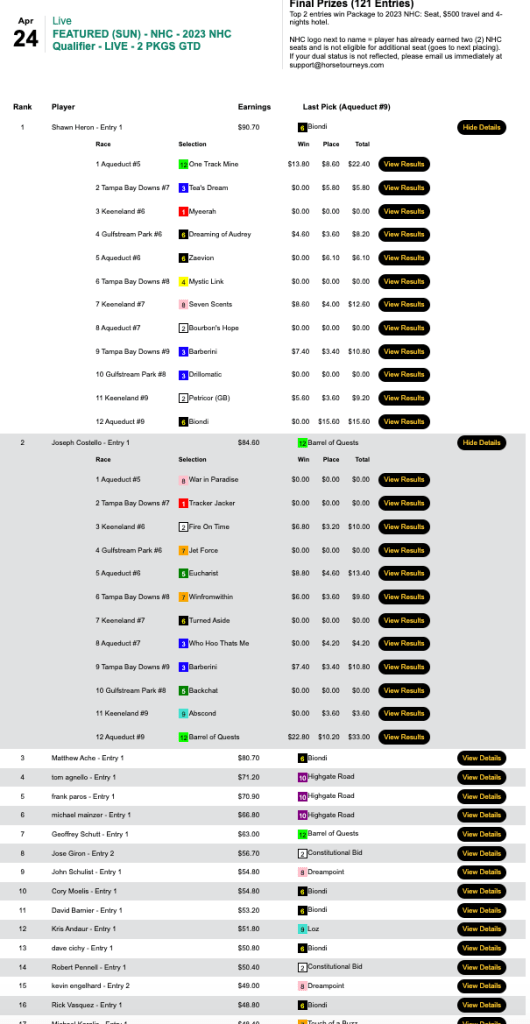 The only price of note was Barrel of Quests ($22.80, $10.20) in the final contest race, the 10th at Aqueduct. Heron didn’t even have that horse, but still managed to accumulate a very-high-for-the-day $90.70 thanks to 5 wins and 3 places. The 2021 NHC Tour champ Kevin Costello (5 wins, 1 place) DID have Barrel of Quests, and he received the other available 2023 NHC spot.