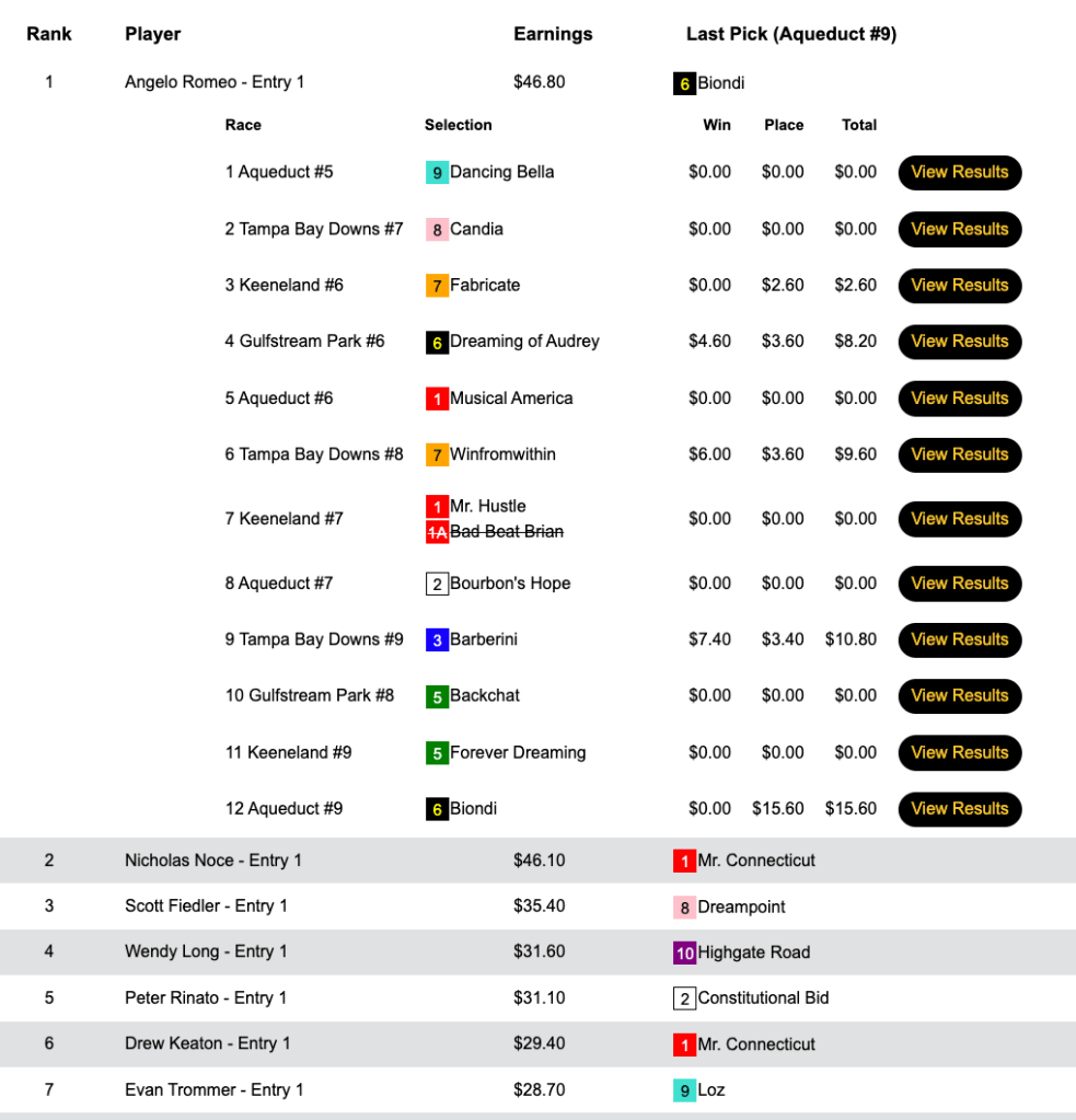 And it was a pretty significant qualifier at that. Angelo Romeo (3 wins, 2 places) is headed to The BIG One after he caught a $15.60 place payoff in the final race to finish with a 12-race total of $46.80, topping all 24 of his opponents. Romeo also earned a $500 bonus for his win (as all The BIG One online qualifiers do). He will be one of no more than 57 in the September competition.